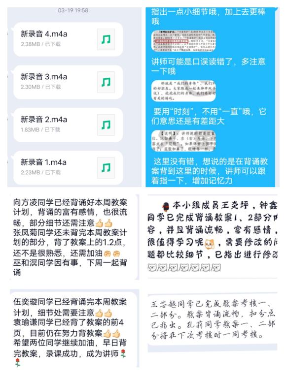 支队将原计划的“一对一线下授课考核”调整为“一对一线上录音考核”。预备讲师将背诵的教案以录音的方式发给负责人,负责人再根据考核标准,逐一核对,并将结果及时反馈给预备讲师。可这样的线上考核方式,只是权宜之计,因为不能面对面授课和考核,预备讲师的考核质量无法保证。于是,自4月1日起培训部在征得书院同意,并控制人数,做好防护措施的情况下,开始了线下录课考核。录课环节,为帮助预备讲师克服焦虑和紧张,培训部和讲师们分享了自己考核时的经验,并不断鼓励和支持她们,让她们顺利通过考核。