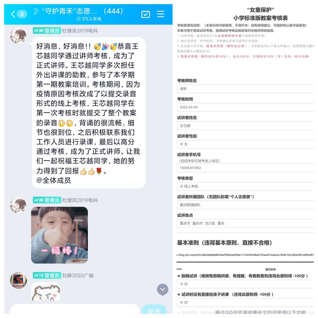 3月初,为壮大守护青禾讲师队伍,支队培训部制定了详细的培训计划。培训开始前,支队通过发放承诺书,招募志愿者们成为预备讲师,预备讲师即可参加后续的培训活动。在3月9号、11号两期的培训中,支队邀请了经验丰富的老讲师,现场为预备讲师讲解教案,圈划重点,让预备讲师充分理解教案,以及对讲课现场可能出现的意外情况做足心理准备。然而,就在同学们完成培训,即将进入考核环节时,重庆疫情愈发严重。支队临时改变考核计划,积极筹备线上考核,持续不断地推进考核工作的顺利开展。