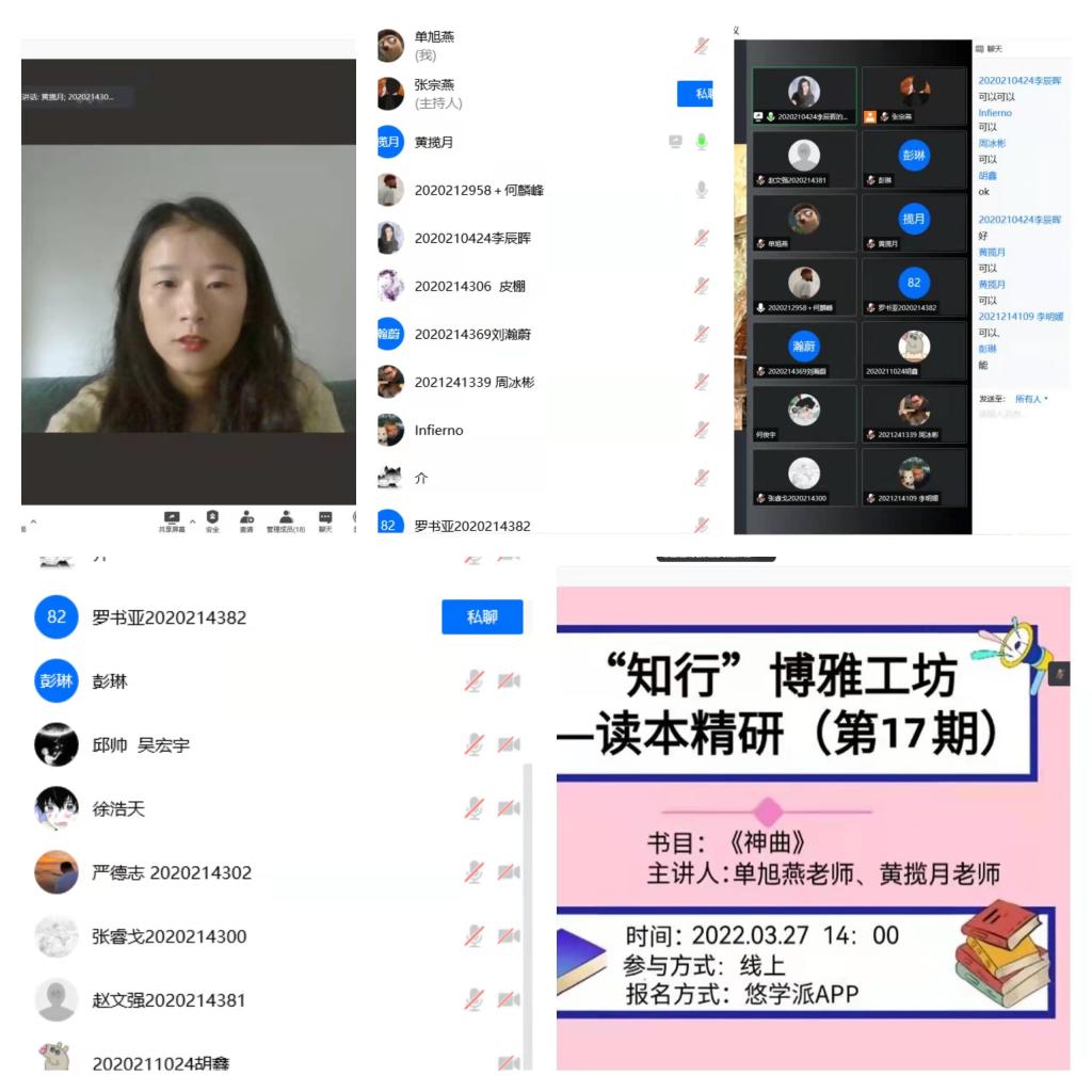 为落实学校疫情防控要求,本期读本精研活动通过腾讯会议在线上展开,由通识教学部单旭燕和黄揽月两位老师带领20余名同学共品但丁的经典著作《神曲》,虽然隔着屏幕,但丝毫不影响大家的学习热情,各小组从不同的角度品读并依次陈述《神曲》的经典之处。