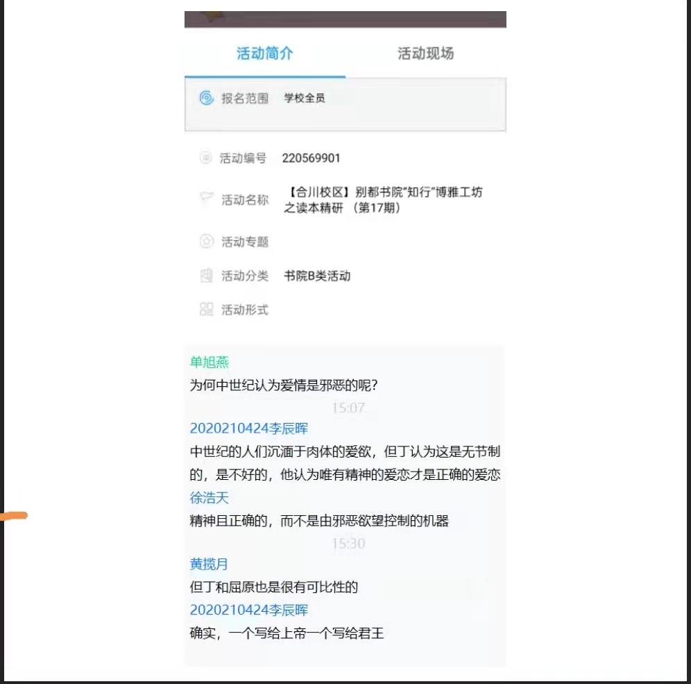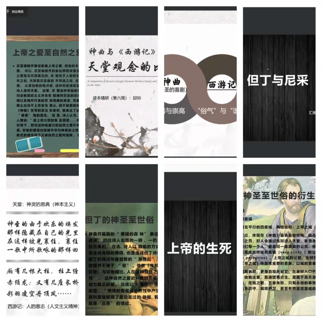 本次读本精研活动,同学们结合经典思考了但丁对时代的反思,对爱情的追逐,对欲望的认知和掌握;讨论了神圣与世俗、理性与意志、天堂与天庭;展现了不同视角与不同学科间的融合。这也正是《欧洲文明的现代历程》创新第二课堂的目的所在。