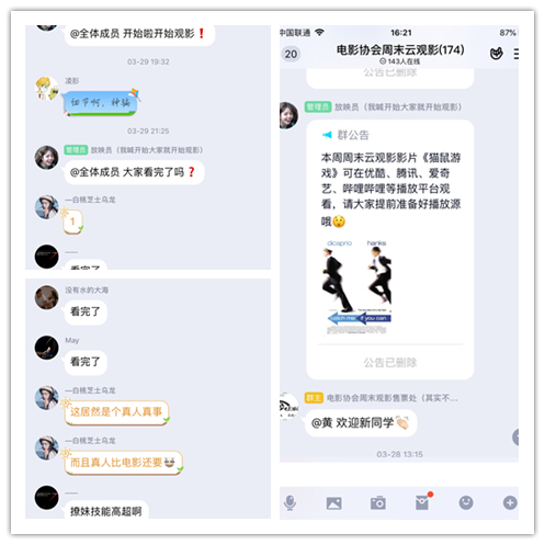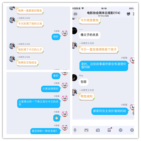 线上观影结束后,力老师与同学们借助网络平台对电影进行映后分享。在映后讨论中,力老师以问题意识为导向与学生们交流,让学生对该作品有了深度地讨论和理解,并向同学们提出了两个问题:1、《猫鼠游戏》的多角度分析,2、《猫鼠游戏》的主题与意义,同学们对以上两个问题进行了认真地思考与讨论之后,力老师做了较为全面的分析和总结,使师生间的交流充实而愉快。