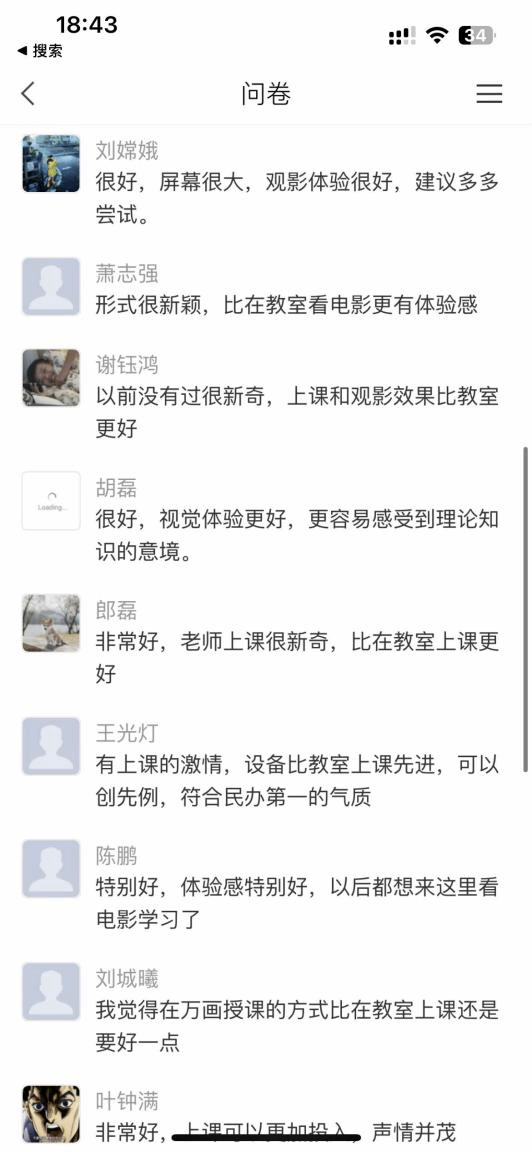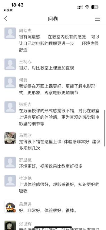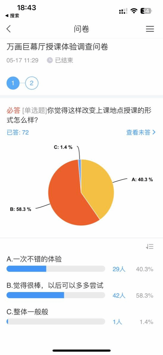 授课结束后,何老师也通过调查问卷的形式收集了同学们对本次授课体验的感受。通过问卷结果可以看出,绝大部分同学都给予好评,希望还有机会将课堂搬到影院。