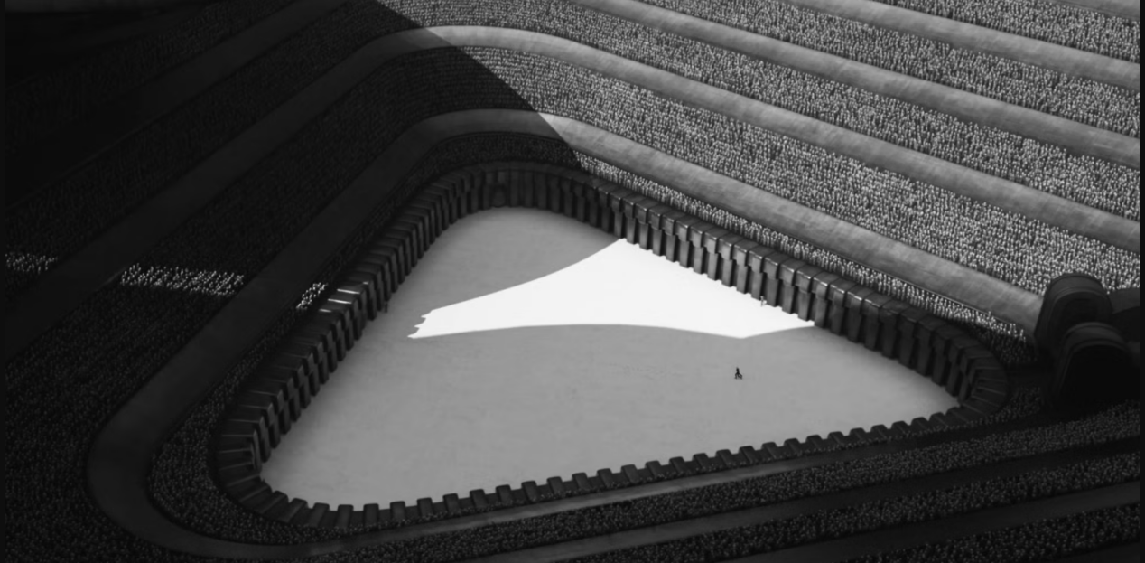 《沙丘》的视听效果造成了心理上的恐惧感,这是陈霞老师自陈的观影体验。罗老师随即以这一点作为本次双师课堂第三部分的线索,并以《沙丘2》中“角斗场”片段作为分析的对象,阐释《沙丘》的艺术中的法西斯美学特征。他以齐美尔对审美动机对称性的分析和本雅明的“政治审美化”的概念作为基础,对《沙丘2》中的建筑、战斗场景等做出阐释——即“法西斯主义艺术歌颂服从,赞扬盲目,美化死亡。”陈霞老师则以纳粹纪录片导演莱妮·里芬斯塔尔的《意志的胜利》作为范本,强调其场景、拍摄手法对后世电影的巨大影响。最后,罗磊老师以意大利未来主义者的画作和苏联前卫艺术作品作为对比,指出了政治审美化和艺术政治化之间的辩证关系。