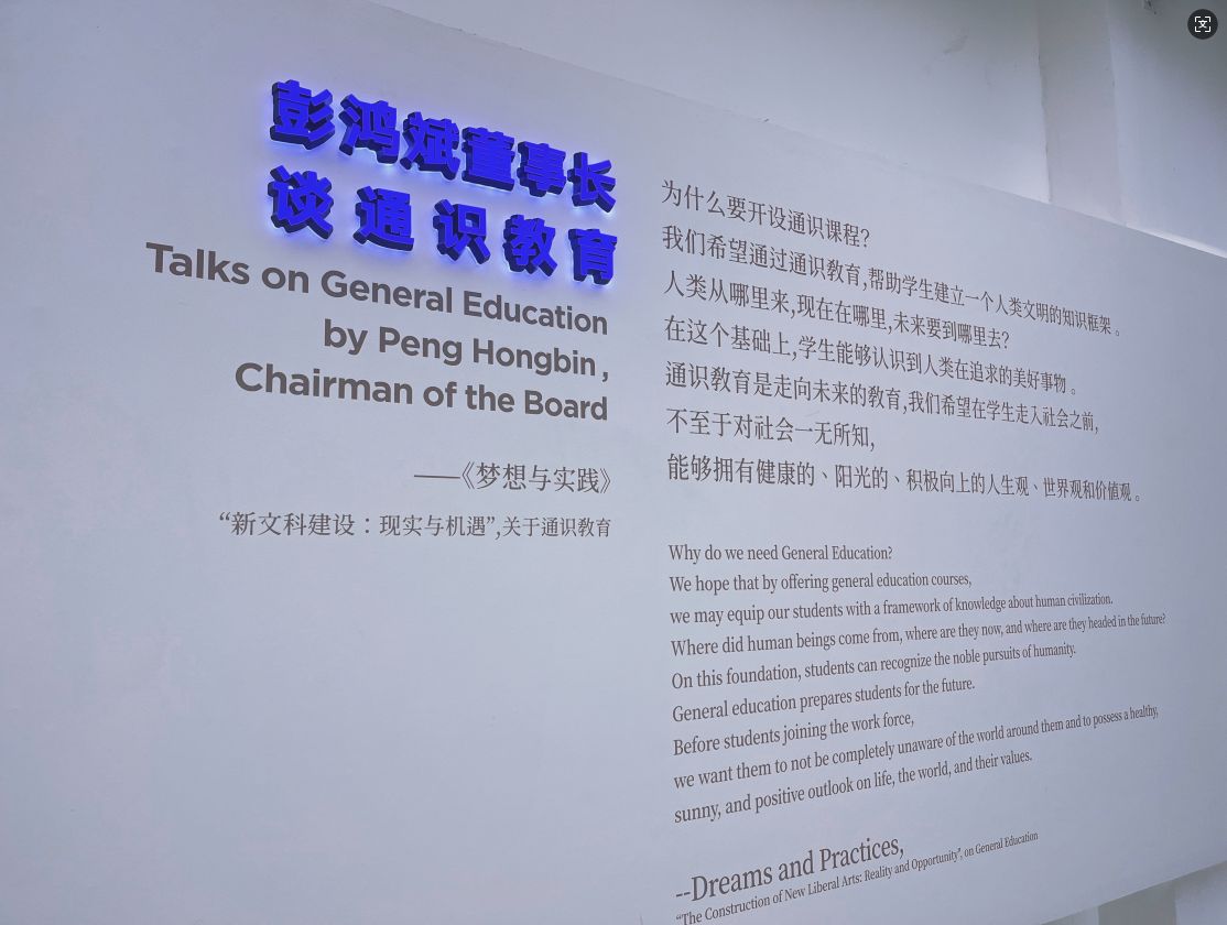 “为什么要开设通识课程?我们希望通过通识教育,帮助学生建立一个人类文明的知识框架。人类从哪里来,现在在哪里,未来要到哪里去?在这个基础上,学生能够认识到人类在追求的美好事物。通识教育是走向未来的教育,我们希望在学生走入社会之前,不至于对社会一无所知,能够拥有健康的、阳光的、积极向上的人生观、世界观和价值观。”学校创建者彭鸿斌董事长在《梦想与实践》一书中如是说。