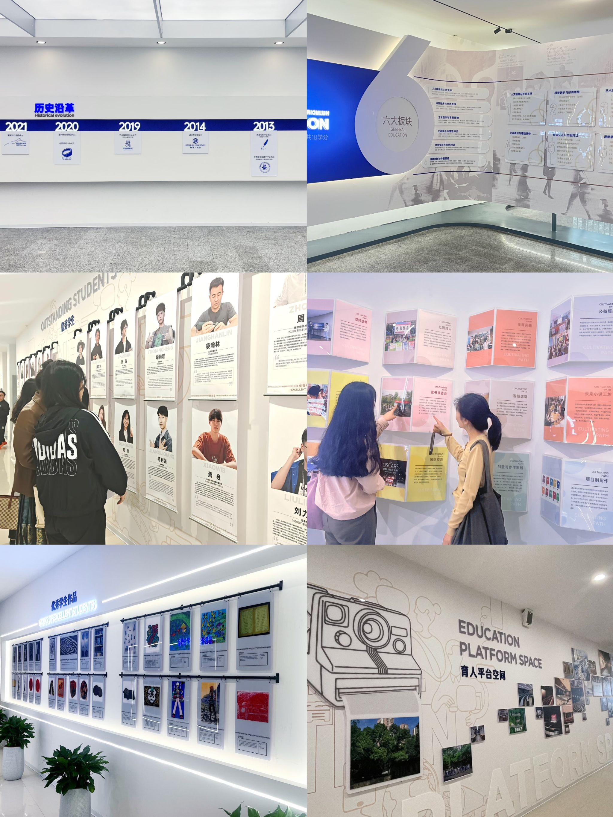 通识展厅墙面上,引用了上面这一段鼓舞人心的句子,为每天来这里上课的师生们开启一扇重视通识教育、关注自身成长、面向未来生活的窗口。“历史沿革”细数学校通识教育各教学单位和管理机构的成立、发展脉络。在展厅的中央区域,集中呈现了学校“通识目标模型”“六大板块课程体系”,以及诸多特色的“培养路径”。从2012年开启的历年通识教育领域的里程碑事件。一处处通识育人平台空间的搭建、改造升级、充分展示,再现了学校不断坚持“以学生发展为中心”教育实践的缩影。每一次鲜活的历练突破,重大的赛事活动,与名校和世界的对话,都在“通识足迹”一一记录。