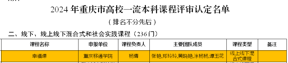 近日,我校通识课程《幸福课》在重庆市2024年一流课程评选中脱颖而出,荣获重庆市线上线下混合式一流本科课程的认定。荣誉的取得离不开集团和学校大力支持,也离不开教学团队的多年耕耘,是对课程教学改革和建设工作的充分肯定,也是我校通识教育发展的又一里程碑。