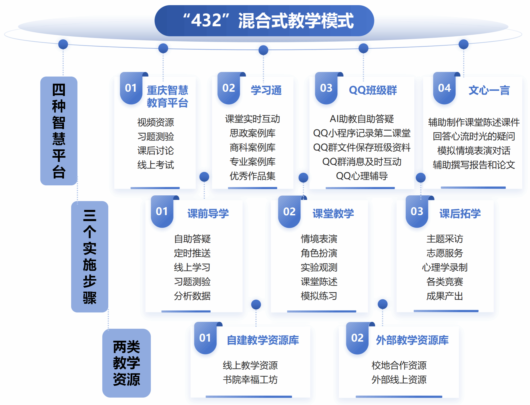 课程依托重庆智慧教育平台,构建了“432”混合式教学模式,即以四种智慧平台为基石,通过课前导学、课堂教学、课后拓学三个实施步骤,依托自建和外部两类教学资源,实现了优质教育资源的共享与互补。该模式将教学环境由教室拓展到书院,再延伸至社会,有效促进了体验式教学与实践育人的深度融合,实现了教学环境的拓展和教学方法的创新。