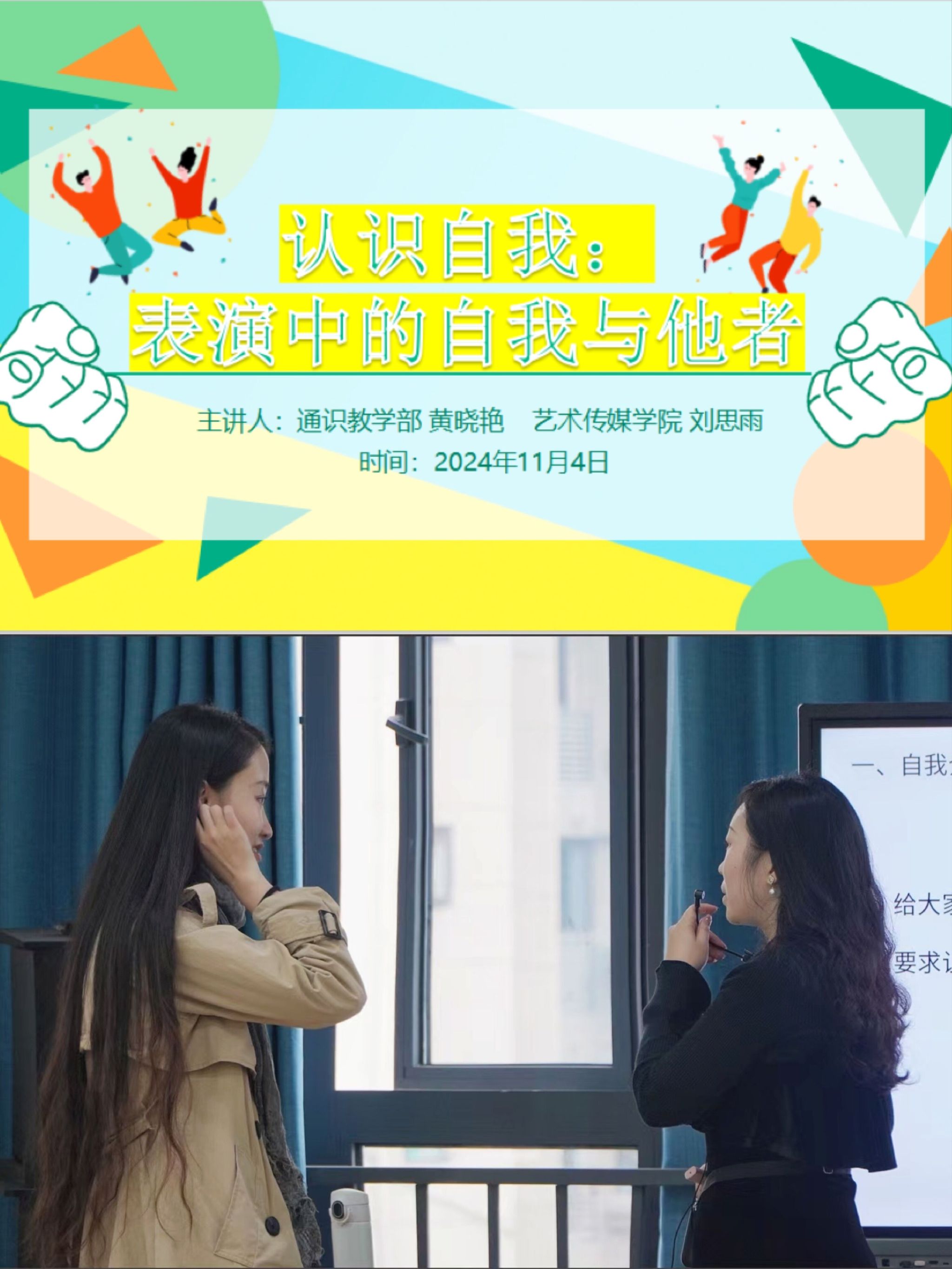 为了激发学生对自我认知的兴趣,促进跨学科融合,11月4日下午4点05分,通识教学部《幸福课》课程主讲教师黄晓艳与艺术传媒学院《播音与表演基础》课程主讲教师刘思雨在天空书院504进行了主题为“认识自我:表演中的自我与他者”的双师授课活动,旨在通过结合心理学相关理论与艺术表演实践,引导学生更好地了解自我,从而增强个人表达能力,提升舞台表现力,呈现出更加动人、真实的艺术作品。