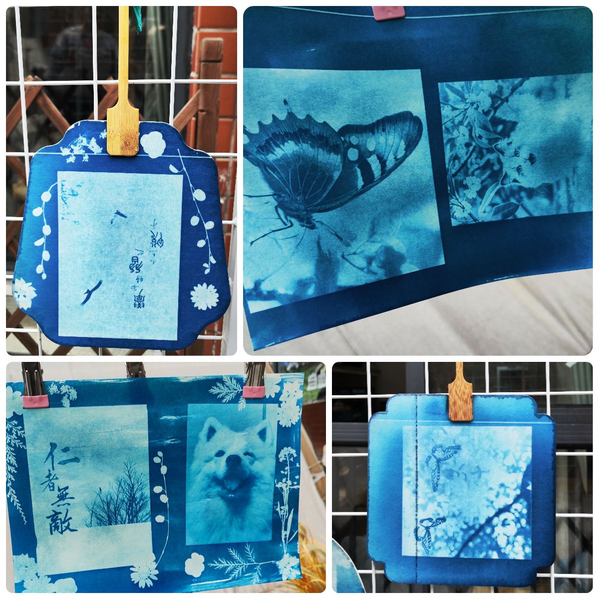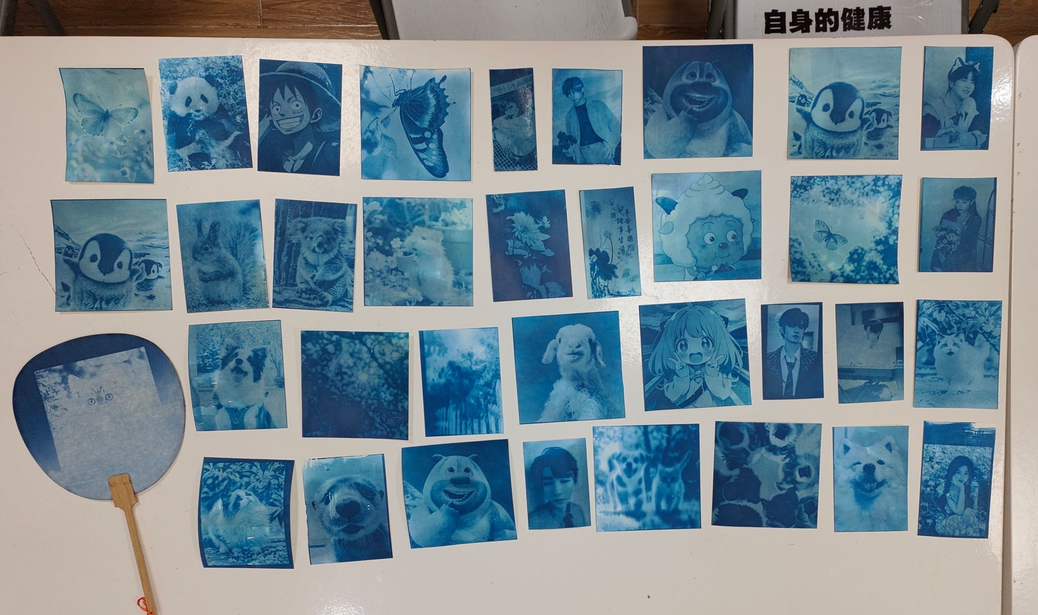 在了解蓝晒工艺的背景和制作过程的基础上,同学们迫不及待地开始了自己的创作之旅。他们寻找并挑选身边的底片、树叶、花瓣等素材,精心设计、摆放出各具特色的图案,将其放在事先准备好的蓝晒底纸上面,再用紫外线灯进行10分钟左右的照射。照射完之后用清水慢慢冲洗相纸。最后再将做好的相纸挂在晾衣绳上或放在桌子上自然风干。晾干后的作品将呈现出独特的蓝色调,每一幅都承载着制作者的创意与情感。在挑选材料与等待晾干的过程中,大家相互讨论、交流心得,共同期待着创意作品的诞生。