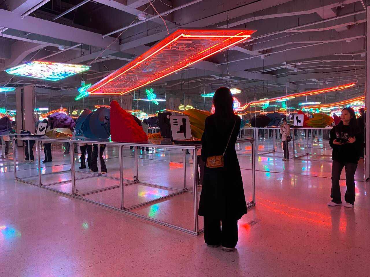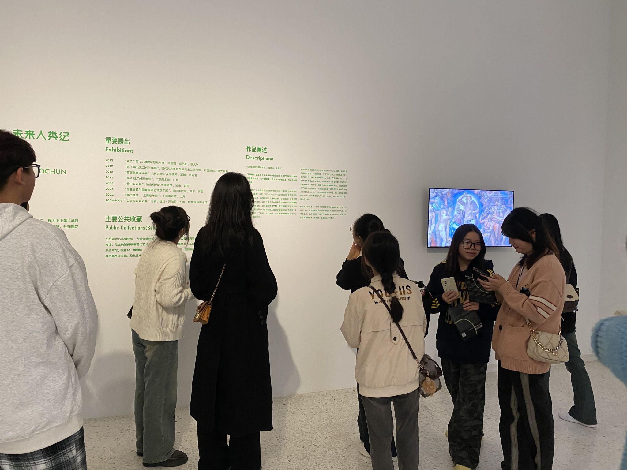 在参观过程中,同学们无不对艺术家们的创作感到惊奇,一号展厅中艺术家缪晓春的《陀螺舞》系列作品,通过隐喻和多重叙事的数字人体的构建,引发了同学们对人类未来生存状态和个人命运的深刻思考。艺术家刘展的作品《联合制造》则通过对“物性”的研究与转换,用充满商品与消费质感的作品“货架”,揭示了在数字与智能时代背景下,人们欲望的放大和“商品拜物教”的控制现象,这也引起了同学们对自己生活方式的反思。二号展厅中,艺术家童昆鸟的作品则是集绘画、机器装置为一体的创作实验。他试图展现一种未来状态下的“人机结合”之可能性的画面,为观众呈现了一个充满幽默、戏拟和解构风格的未来世界,这样的表达方式也引起了同学们的热烈讨论,相互交流着自己对眼前作品的理解。