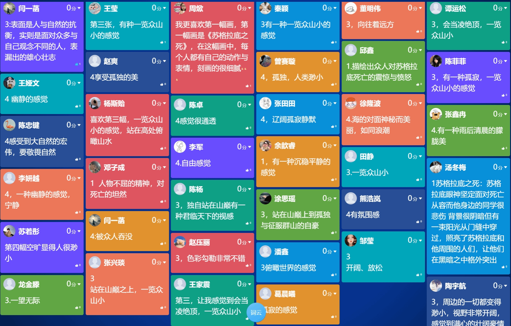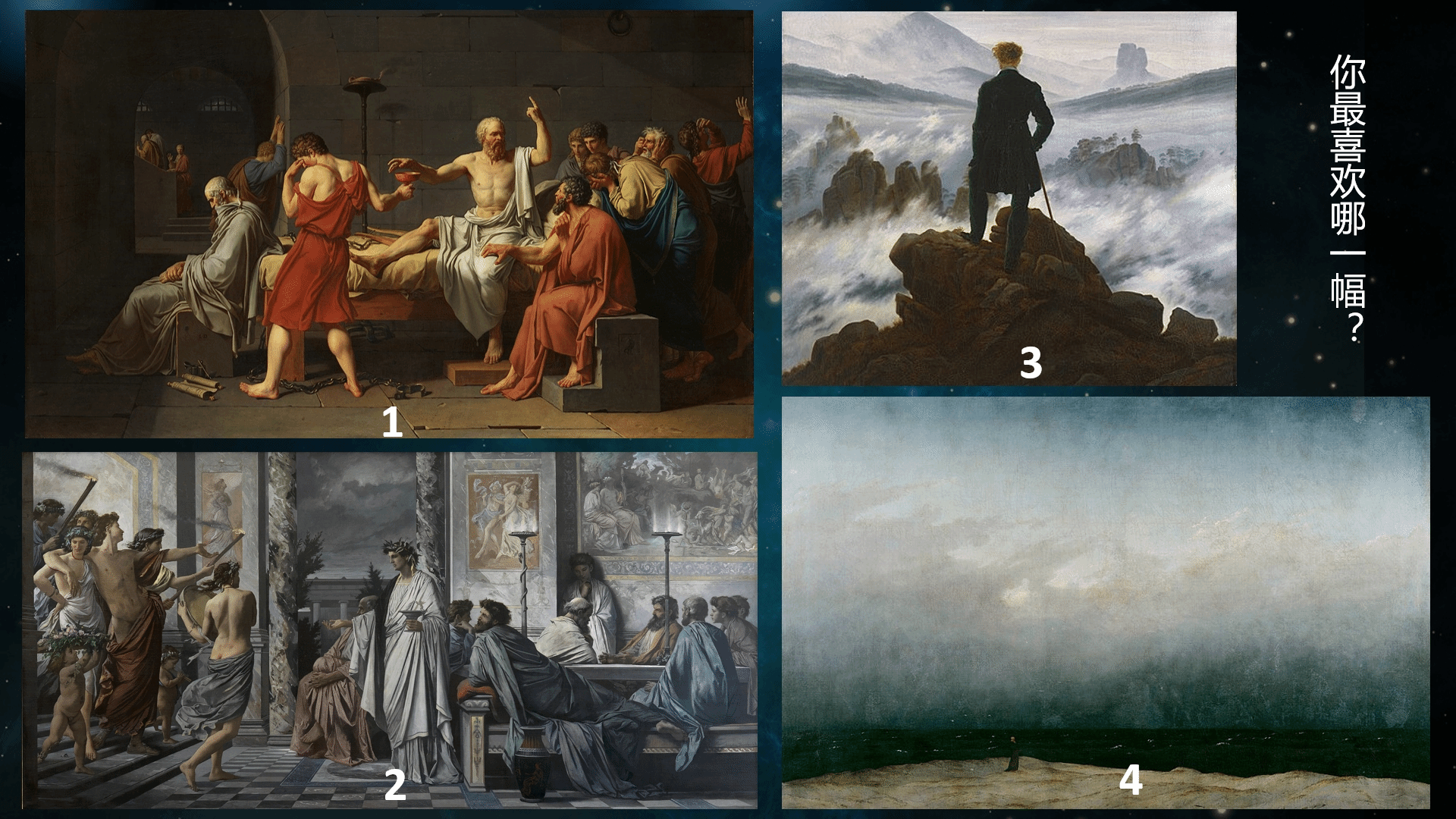 学生们能够感受到前两幅画与后两幅画明显归属于两种不同的流派,而普遍更喜欢后一种风格。他们描述道:第一幅画细腻、生动,让人感受到苏格拉底面对死亡的坦然、众人的震惊与愤怒,但又是沉稳而平静的;第三幅画渺小低矮的山峰、开阔的视野,给人以一览众山眼小的感觉,通透与雄心壮志、孤寂与放松并存;第四幅画幽静、朦胧、空旷、辽阔,海的对面神秘而美丽,如同浪潮,让人感到宏伟、敬畏、孤寂、吞没与人类的渺小……同学们的回答体现了深刻地感知能力、丰富的想象力以及时代的烙印。