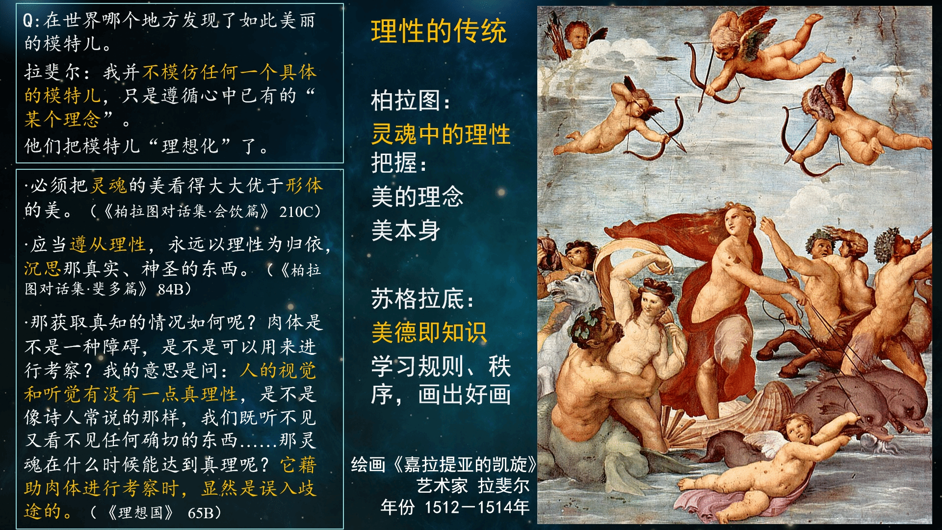 “这种观念正是源自柏拉图”,张娴雅老师引用《斐多篇》《会饮篇》的原文,指出新古典主义力图呈现的超越感官所见的完美,是在把自然“理想化”,它继承自柏拉图的理念论,认为艺术应该要“把握美本身”。那么我们如何才能理解、把握进而呈现这种“理想美”、“标准美”呢?仅仅通过观察、模仿够吗?同学们回答“需要思考、学习”,切中了柏拉图、苏格拉底所主张的理性把握真知的观念,而19世纪的德国哲学家尼采将之称为日神阿波罗的精神,象征着艺术的第一种冲动,代表光明与静观,意味着人们靠理性的能力把握美本身,按照理性所获得的关于美的知识和原则,在绘画中加以呈现。