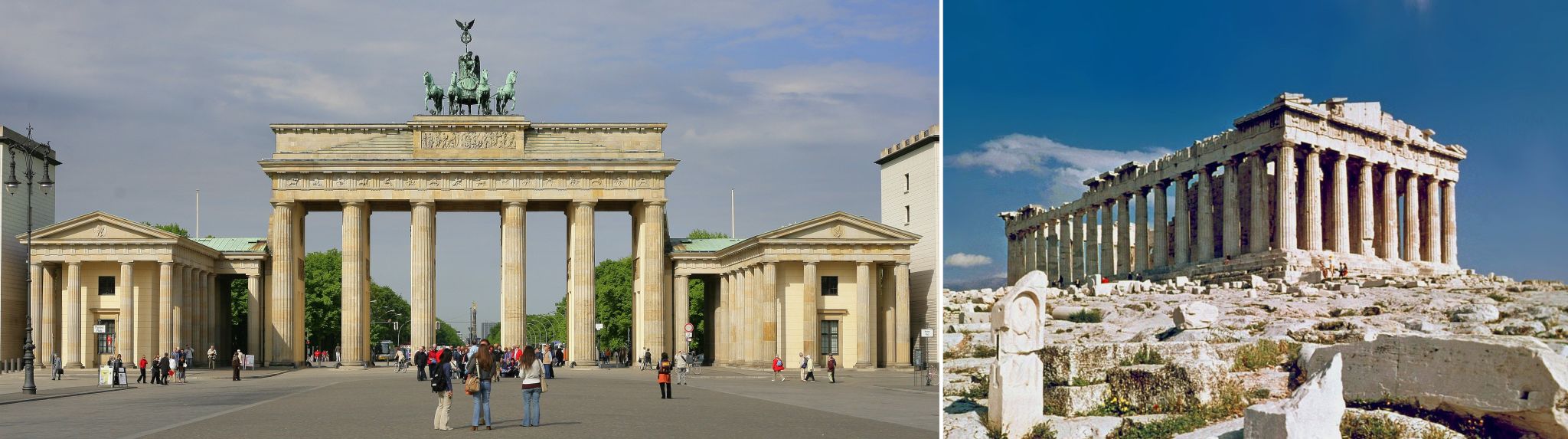 这些回答揭示出两个流派绘画的不同侧重点。前两幅绘画属于19世纪的新古典主义,武桐老师进一步通过阐述苏格拉底之死的背景与《会饮》篇的主题引导学生关注图中人物和故事。同学们意识到,这些绘画着重于场景的描绘,结构的平衡、和谐,画中人完美的形体表明这并不是对普通人的直接描摹,故事也着重展现古代重大事件和英雄人物,力图表现他们的悲壮、美丽。最后,她引用德国艺术史家温克尔曼的名言“高贵的单纯和静穆的伟大”来总结这一流派艺术的基本精神,并简单对比了柏林勃兰登堡门和雅典卫城这两种建筑以加深直观感受。