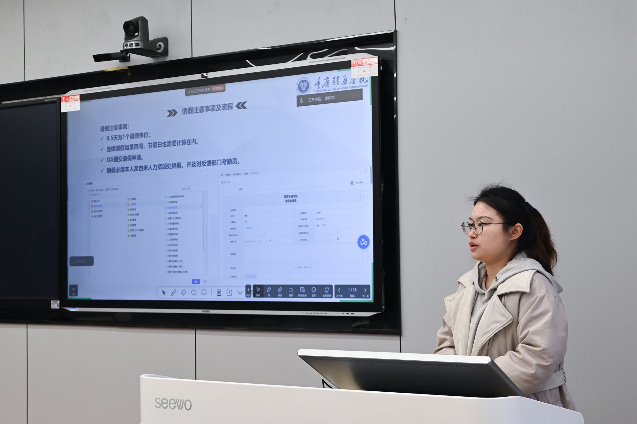 合川校区人文教研室主任唐钦钦老师围绕“考勤制度及试用期管理制度”这一主题,详细解读出勤时间规定、请假及注意事项、处罚机制等考勤制度,以及试用期间的管理和部门考核等内容。在岗教师必须按教学要求,在规定的时间周期内,完成指定教学计划和工作任务。对这些制度的详细解读,为新教师们树立严谨的教学态度与规范意识。