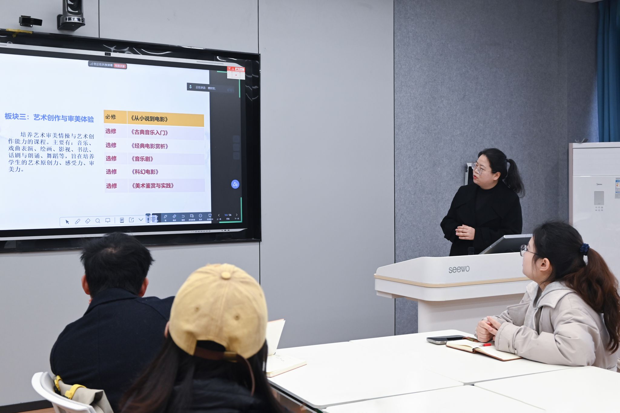合川校区历史与艺术教研室主任邓露露老师先强调教师需要加入相应的教研室QQ、微信群组,及时获取工作信息和通知。关注“移通通识”的公众号,方便了解通识整体的工作进展。其后,介绍了通识教育的六大板块,每个板块都包含必修课程和选修课程,旨在帮助学生建立广泛的知识体系。课程教学中除了常规的理论课程讲授教学之外,还会涉及更多学生的互动。同时,所有的通识课程是由多部门协同授课。