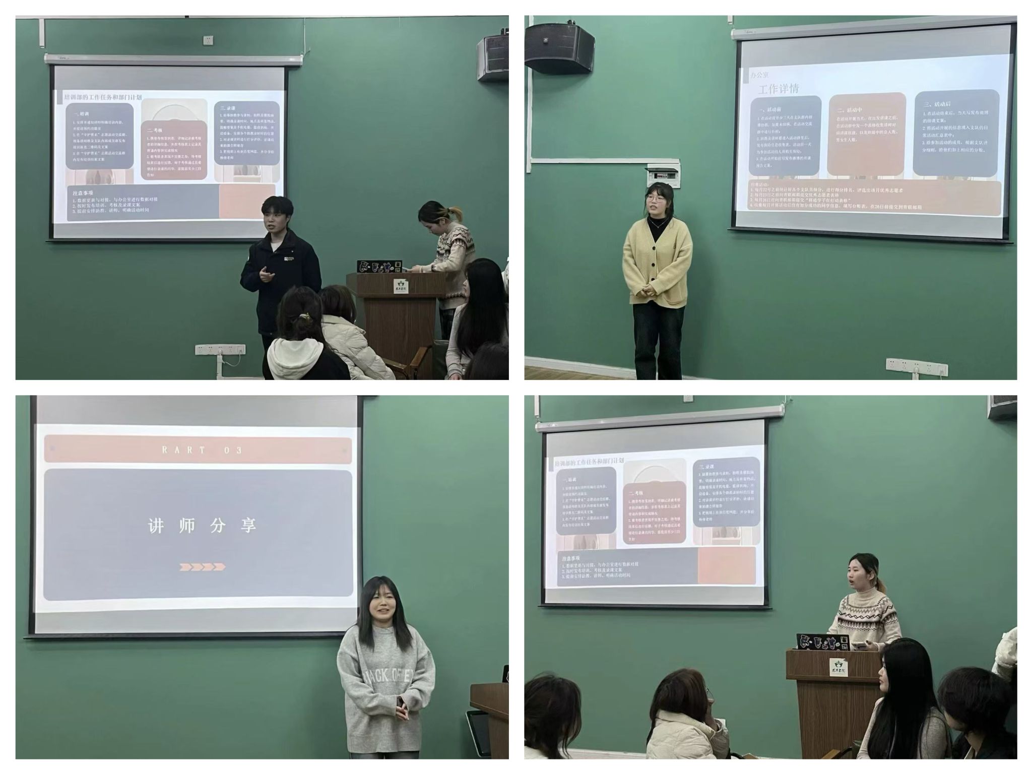 紧接着,各部门负责人依次上台进行工作汇报。培训部部长黄鑫首先进行总结汇报,他对本学期部门的工作如何开展进行了详细的说明和解答,为培训部的工作奠定了坚实的基础。接着,宣传部部长夏子倩对宣传部新一学期的工作进行了阐述,包括约课活动、新闻稿撰写情况以及活动宣传等多个方面,充分展示了宣传部在传播志愿理念和活动推广方面的积极作用。办公室部长宣思忆则清晰地阐述了新学期的部门目标,体现了办公室在日常工作中的细致入微与严谨态度。最后,支队队长郭庆越在各部门汇报结束后进行了总结发言。她首先对新加入的成员表示了热烈欢迎,新成员的加入为支队注入了新鲜血液,带来了新的活力与创意。同时,也对成功考上讲师的队员们表示了祝贺。郭庆越特别提到,支队的成长离不开通识教学部各位教师们的悉心指导,为支队的发展提供了坚实的理论基础和实践方向。