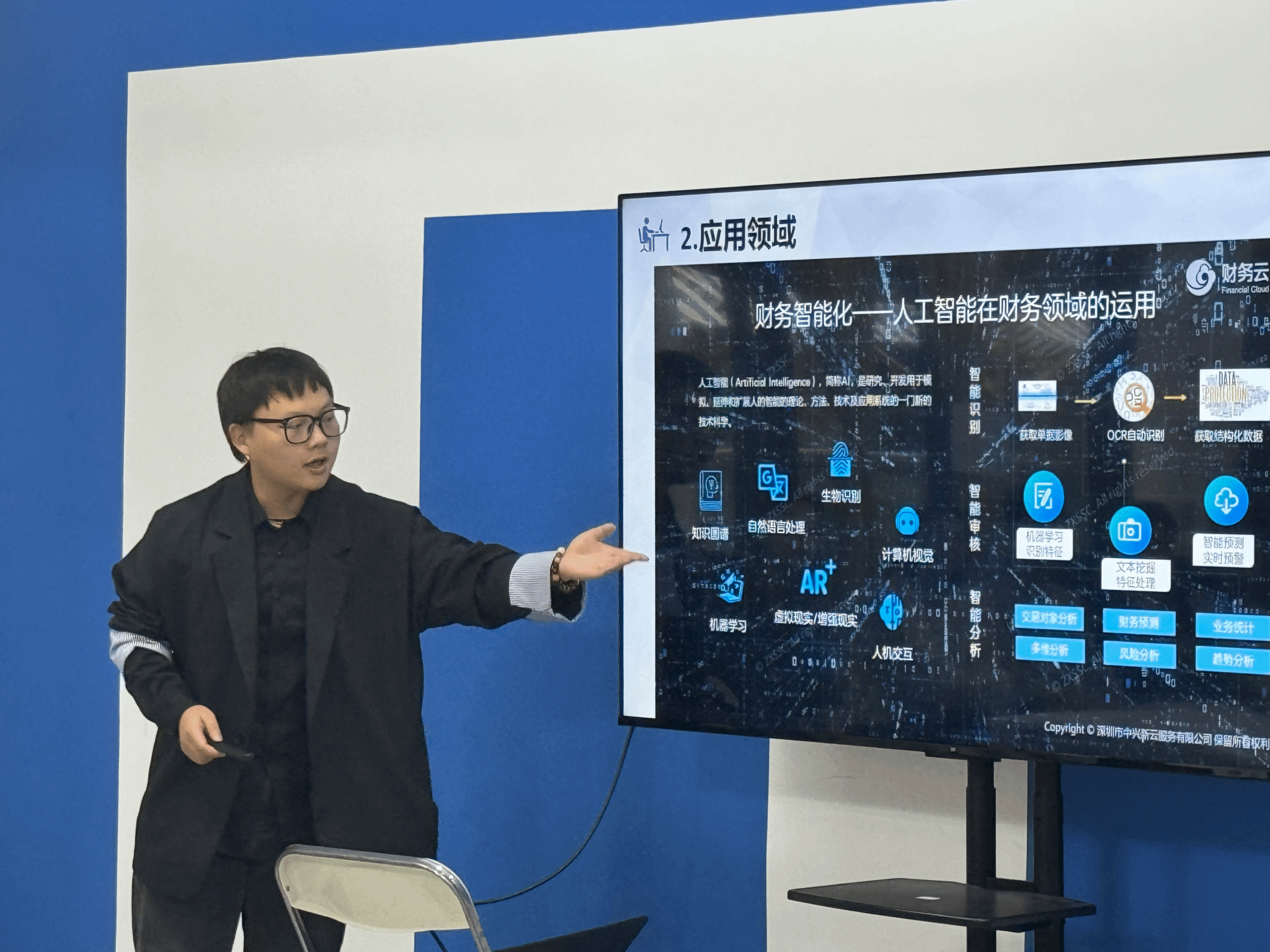 随后,刘彪老师分享了人工智能技术的最新趋势及其对会计、工商管理领域的影响。如今,各高校正在积极探索人工智能与商科教育的有机结合,为培养多学科融合背景下的复合型高素质人才充分赋能。以人工智能为主题的新商科教育区别于传统商科,以学生为中心,以人的发展为导向,以培养能力为主旨,以知识创新为目标,力求通过智能教育技术实现基本知识教学和人格的发展与完善,体现新商科教育的智能化、特色化、个性化、人性化等特征。此外,刘老师对于当前人工智能在多个领域的应用,尤其是财务领域的运用做了详细介绍。例如系统在获取财务单据影像后,自动进行OCR识别和结构化数据的获取,从而形成“智能识别——智能审核——智能分析”的完整应用链条。人工智能技术不仅能够提高会计核算的准确性和效率,还能够优化财务报告、管理会计和内部控制等环节,推动会计学科向数字化、智能化的高质量发展阶段迈进。