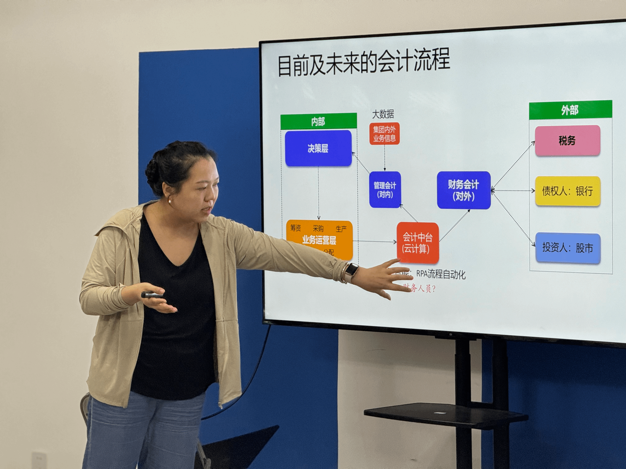 淬炼商学院的李海燕老师就“财务管理专业与智能化的结合”为题进行了汇报。其中特别提到了2023年影响中国会计行业的十大信息技术,并以内、外部多视角对传统会计流程和当前及未来的会计流程进行了全面对比,提出学生培养方案应以企业需求为导向,顺应趋势进行动态调整,推动课堂学习和社会实践的紧密衔接。