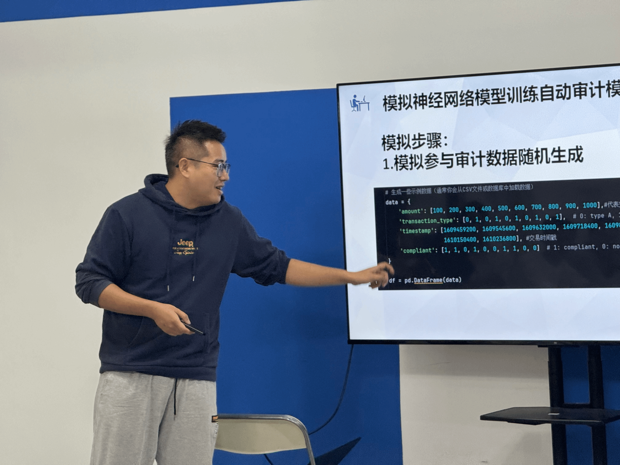 周海波老师围绕人工智能在财务自动化、智能审计、风险管理等方面的应用案例与挑战进行了分享。周老师以“模拟神经网络模型训练自动审计模型”为例,讲解了模型的模拟步骤,演示了如何对参与审计数据进行随机生成,如何进行数据预处理和划分,如何进行模型构建,以及如何解读运行结果。通过生动的案例讲解,将晦涩的程序语言转变成通俗易懂的文字,让与会教师受益匪浅的同时深感计算机语言的神奇魅力。