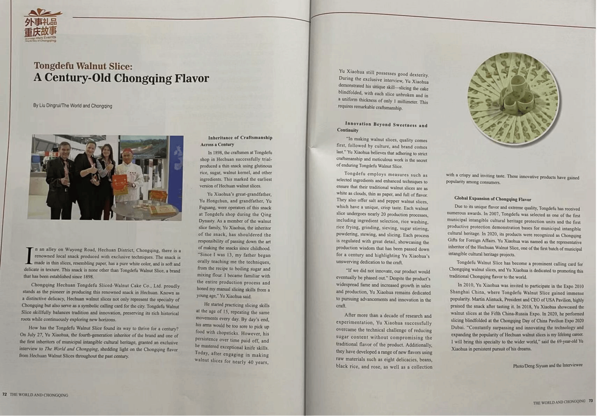 独树一帜的风味和精益求精的品质,让重庆合川同德福桃片屡获殊荣的同时,余晓华也肩负起了百年老字号的“传承与发扬”使命,更加着眼于将这一张百年的传统风味名片推向世界。从2010年至2020年的十年间,余晓华先后在上海、俄罗斯、迪拜等地受邀参加了各届博览会,真正用行动践行了重庆合川同德福桃片第四代传承人对重庆味道走向世界的执着梦想。