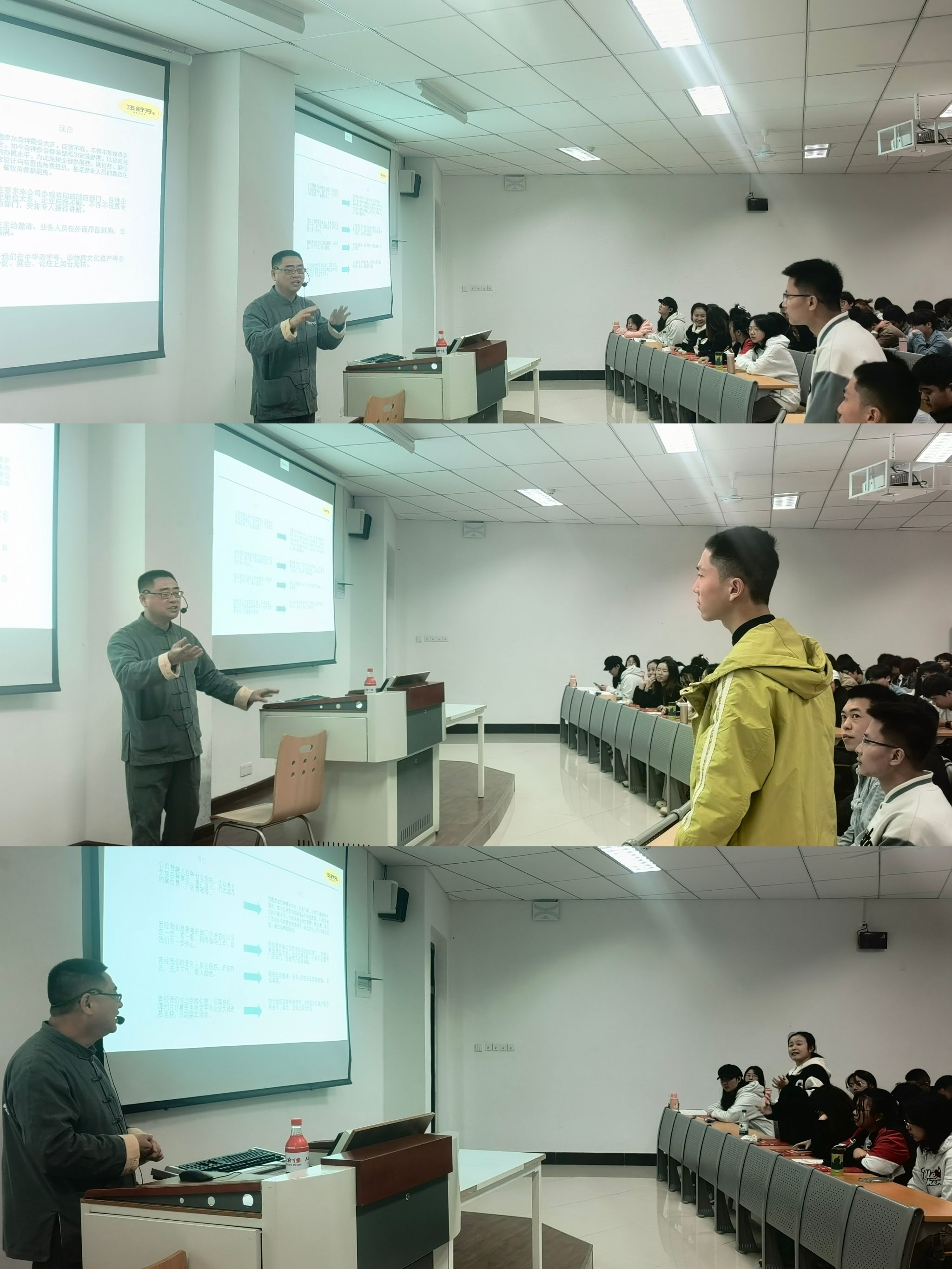 在互动环节,同学们热情高涨,积极提问。2024级电子信息专升本6班的张骏齐率先询问何舒芳产品及市场定位,谭强经理微笑解答,列举伍舒芳主导产品,并强调其中药现代化努力及精准市场定位。2023级数字媒体艺术4班的蒋振扬随后就新媒体传播策略发问,谭经理详述企业紧跟时代步伐,利用新媒体与消费者互动,精准触达目标受众的策略。2023级数字媒体艺术3班的龚毓婷提出中药面膜的创意问题,谭经理赞赏之余,透露企业正探索中药产品吸引年轻人的想法。虽互动时间有限,但谭经理的睿智风趣及对企业品牌的深厚情感已深深感染了在场的每一位同学。
