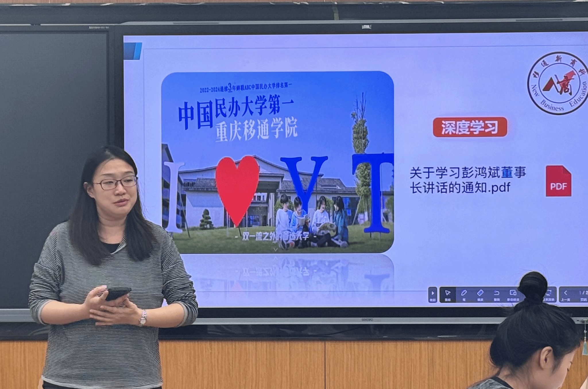 2024年10月30日下午,合川新商科教学部领导力提升课程教研室和马克思主义学院马克思主义基本原理教研室的全体教师在天空301一起学习了彭鸿斌董事长《见自己,见天地,见众生》和《世上每个人花期不同,你也会和美好相逢》两篇讲话。