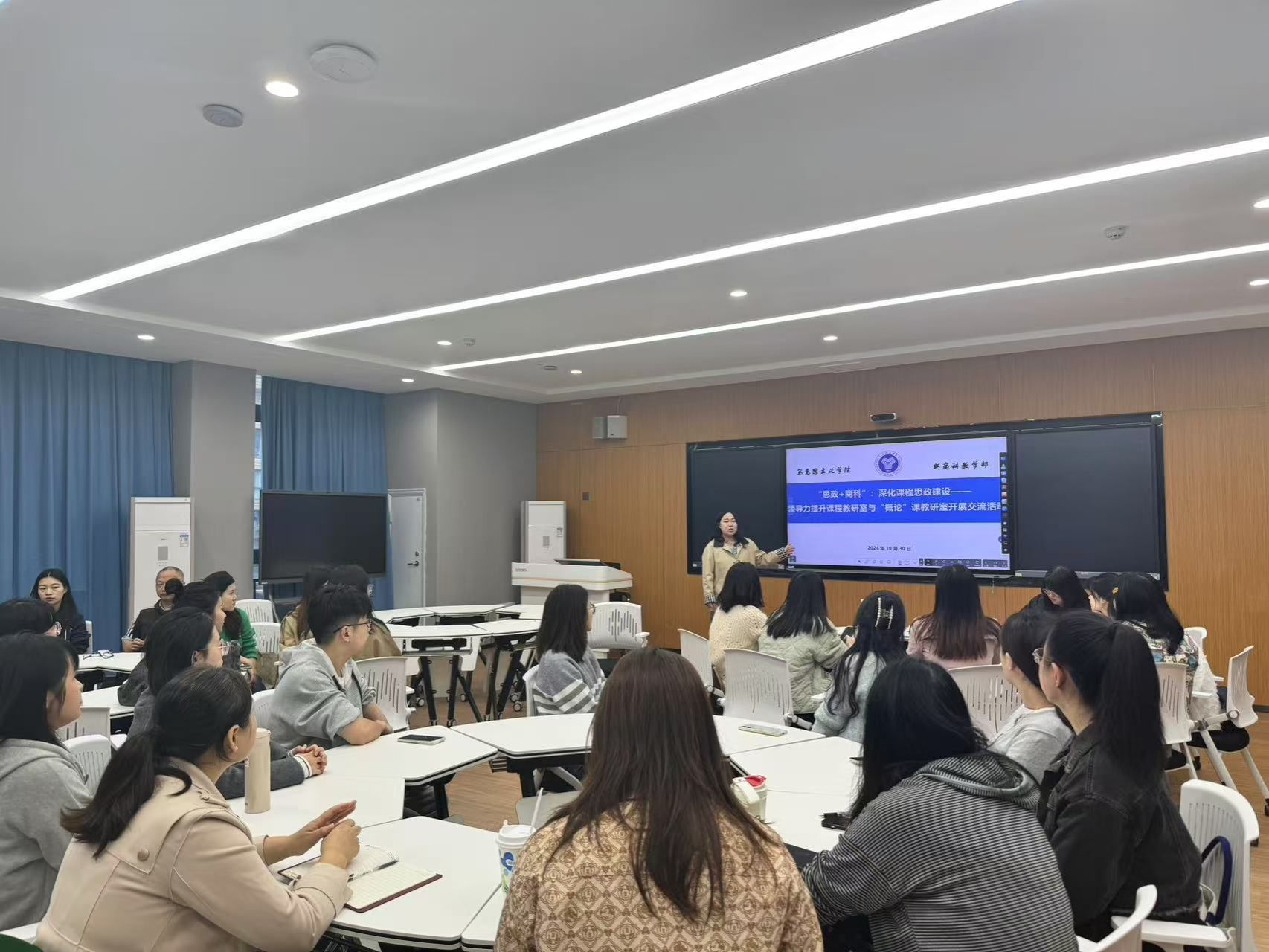 10月30日,新商科教学部领导力提升课程教研室与马克思主义学院“概论”课教研室在天空301成功举办了以“深化课程思政建设”为主题的交流活动。此次活动旨在加强学科间的合作,提升课程思政的实施效果,推动思想政治教育与专业课程的深度融合。