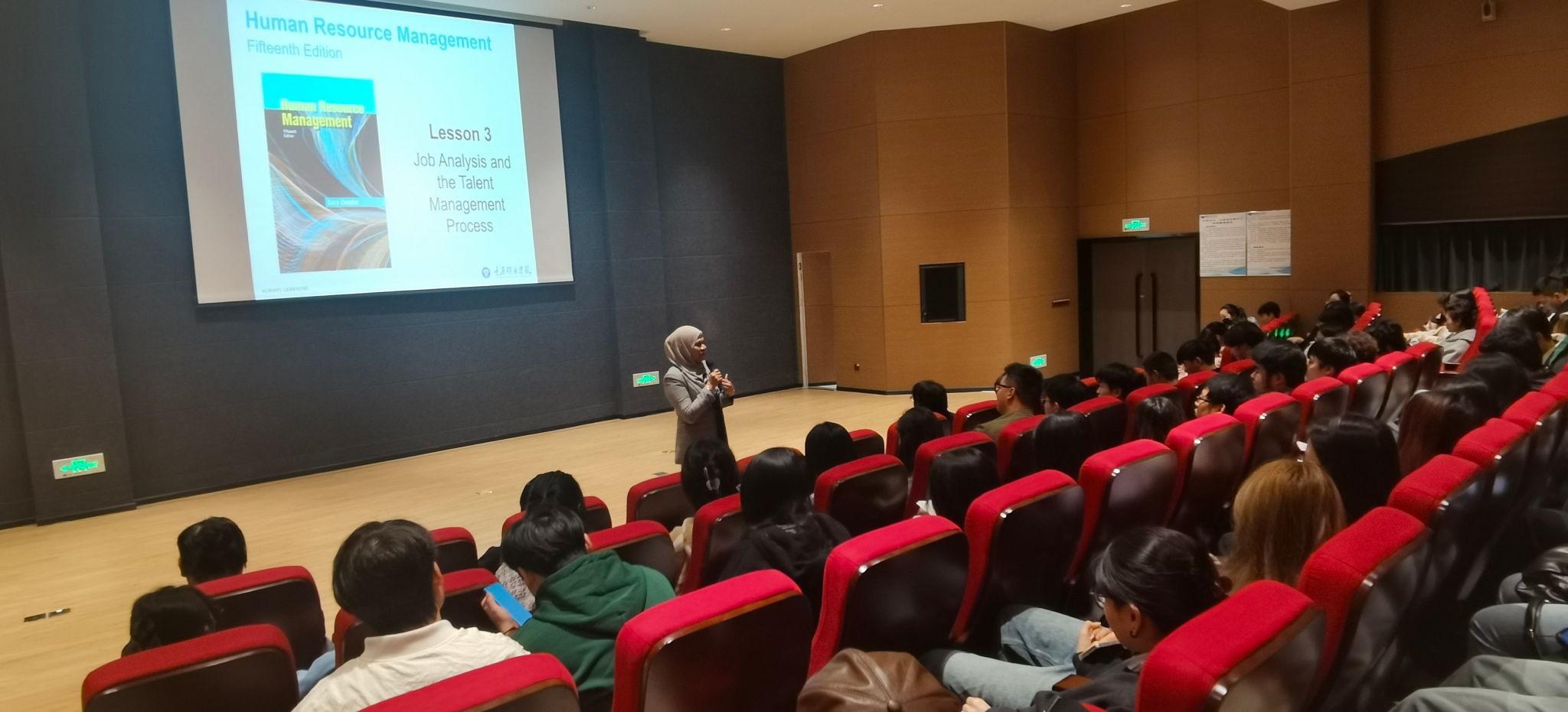 11月1日上午,哈斯丽萨教授为我校学生带来了一堂全英文的人力资源管理课程,主题聚焦于“工作分析”的关键内容。课堂上,她结合实际案例详细分析了工作分析在优化组织结构和提升工作效率中的重要性,同时指出其在制定人力资源战略中的核心作用。由于课程全程采用英文授课,不仅提升了学生的专业理解力,也在无形中提高了他们的英语听说能力。哈斯丽萨教授风趣且富有启发性的授课风格深受学生喜爱,课堂氛围活跃,学生积极参与讨论和互动,课程效果显著。