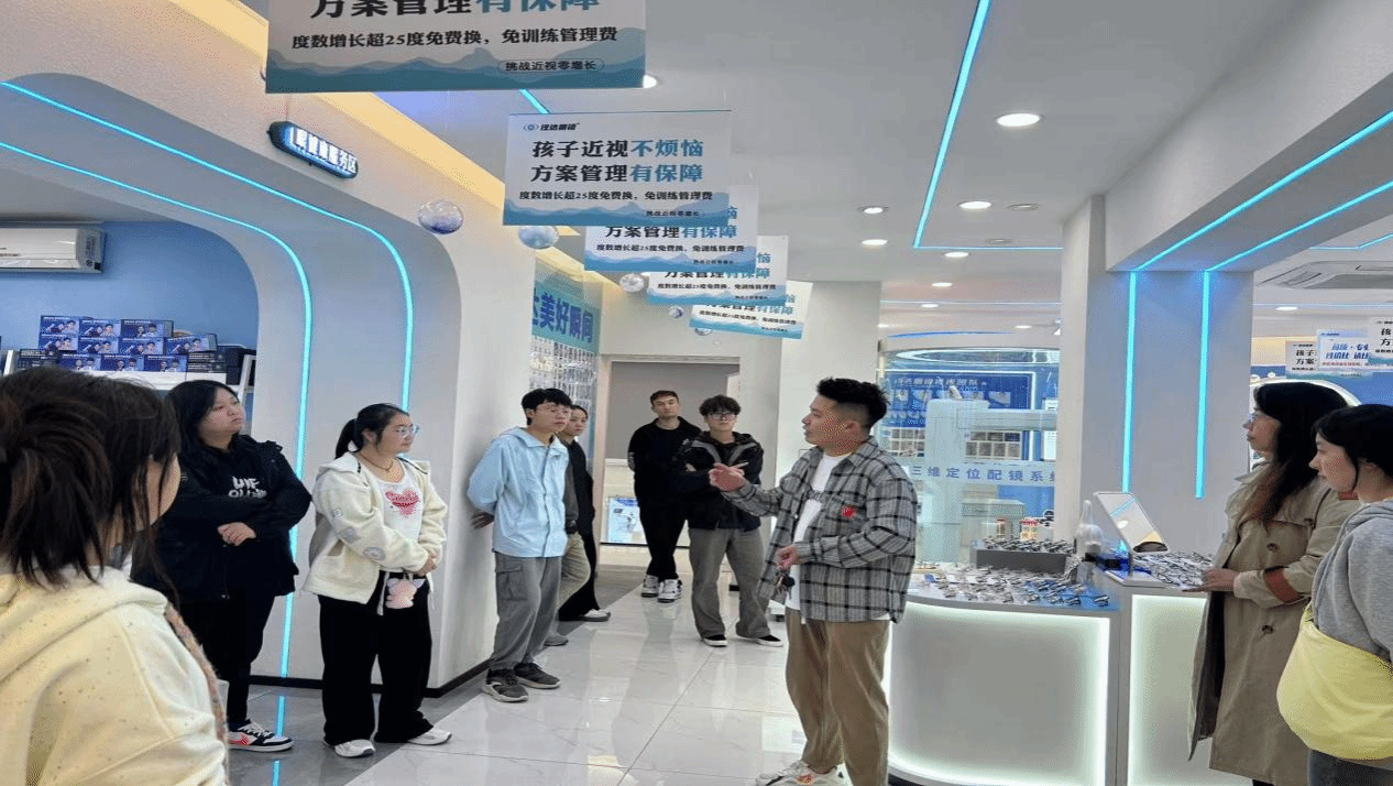在交流中,有学生提出体育场店的装修看起来虽然时尚,但似乎不能体现其专业性。艾总又带领同学们去参观了另一家店铺,这里的专业性让同学们大吃一惊,不仅亲眼见到了各种精密的仪器和经验丰富的验光师,更深刻理解了产品背后的创新理念与市场定位。艾总对同学们的热情参与表示赞赏,并表示愿意为同学们提供更多的实践机会和资源支持。