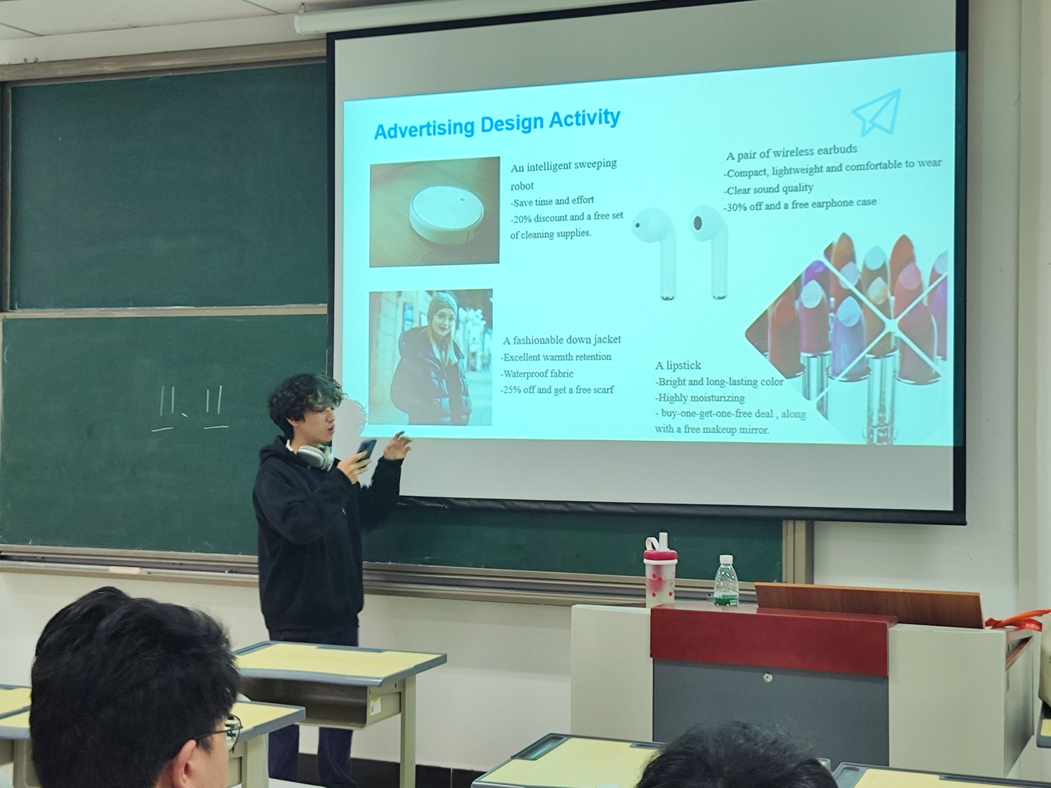 课程的精彩环节还在继续,四组学生围绕电商消费主题精心策划并展示了各自独具创意的广告宣传方案。德国留学生还化身专业评委,全神贯注地聆听每组学生的展示,并从多个维度进行了深入细致的评价。他们时而为学生们的奇思妙想点头称赞,时而因某些细节问题而皱眉思考,手中的笔不停地在笔记本上记录着每一个亮点与不足。经过一番激烈的角逐,最终一组凭借其别出心裁的创意理念与近乎完美的精彩呈现成功脱颖而出。
