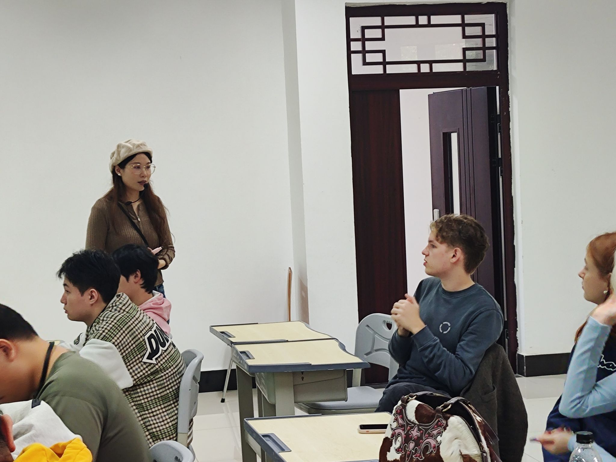 来自德国的 Sarah 率先走上讲台,热情洋溢地为同学们揭开了德国狂欢节的神秘面纱,详细介绍了其独特的传统与充满欢乐氛围的庆祝方式。随后,在全场的期待中,Sarah 带领其他几位留学生一同唱响了欢快的德语歌,那悠扬的旋律瞬间将大家带入了德国狂欢节的热闹场景之中,生动地展示了他们独特的节日“vibe”,教室里洋溢着浓浓的跨国文化交流的温情与喜悦。