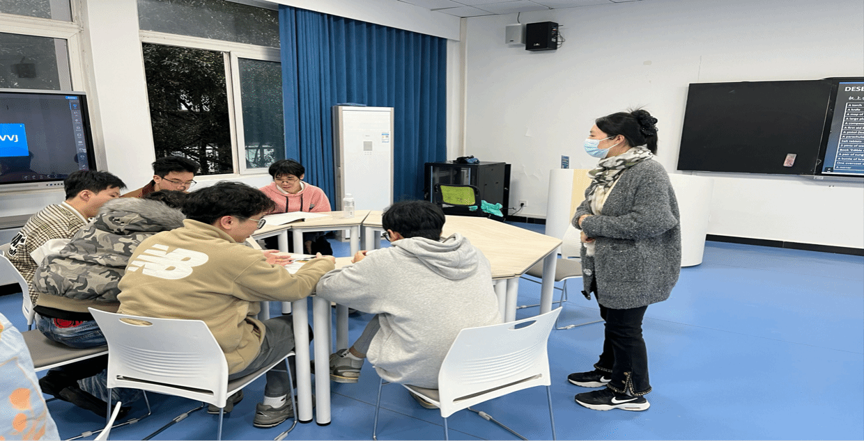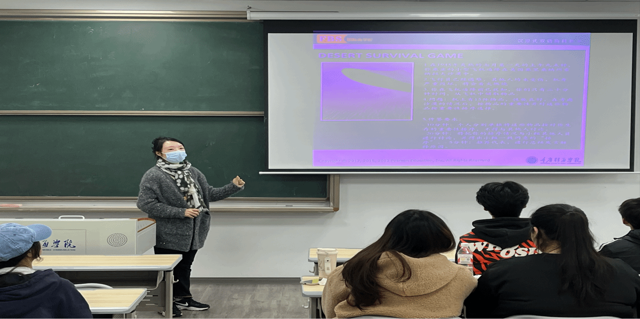 两位老师完成知识讲解后,组织学生们参与了一场别开生面的双语无领导小组游戏——沙漠求生!这场趣味盎然的游戏不仅加深了学生对群体决策的理解深度,还帮助他们将团队沟通技巧付诸实践,淋漓尽致地展现了沉浸式双语课堂的独特魅力,有效锻炼了学生们的英语口语表达能力。