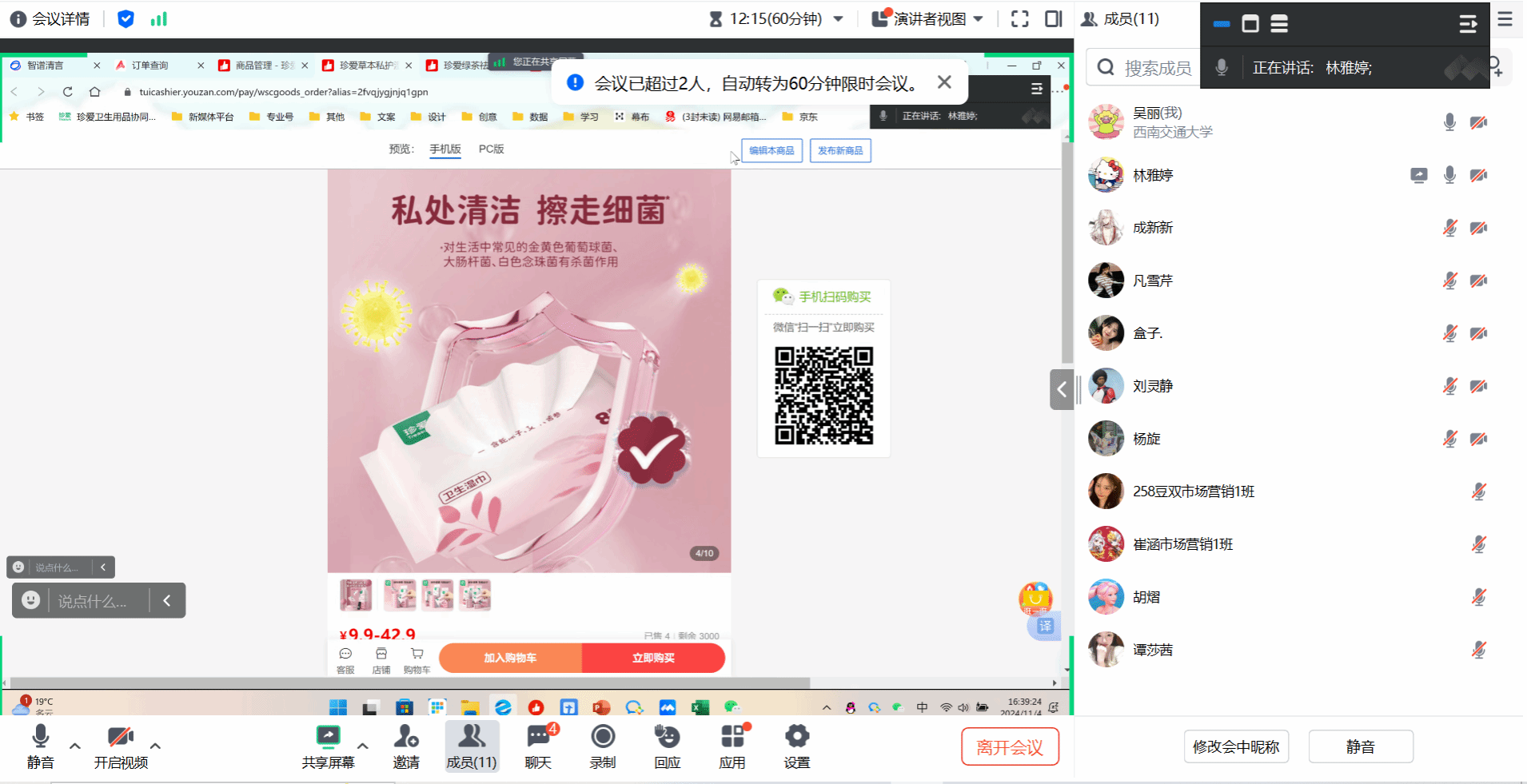 为进一步推进“产赛教三融合”育人模式与《客户关系管理》《新媒体营销》课程改革,淬炼商学院市场营销教研室吴丽老师带领2组实战项目小组学生与珍爱湿巾品牌推广经理林雅婷于11月4日下午16:30,在腾讯会议上开展了交流会。