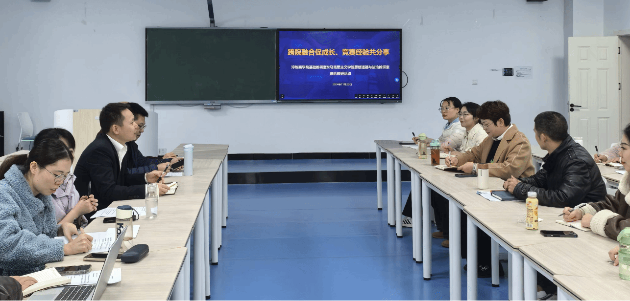 为深度激发教师们教学创新的火花,全面提升教师的教学能力,淬炼商学院基础教研室携手马克思主义学院思想道德与法治教研室于11月20日14:00在五教智慧教室开展了融合教研交流活动。此次活动以高效互动的会议形式展开,会议内容主要有教学竞赛经验分享、团队交流互动等。两大教研室的全体老师参加了本次交流会,会议由淬炼商学院基础教研室主任李邓金老师主持。