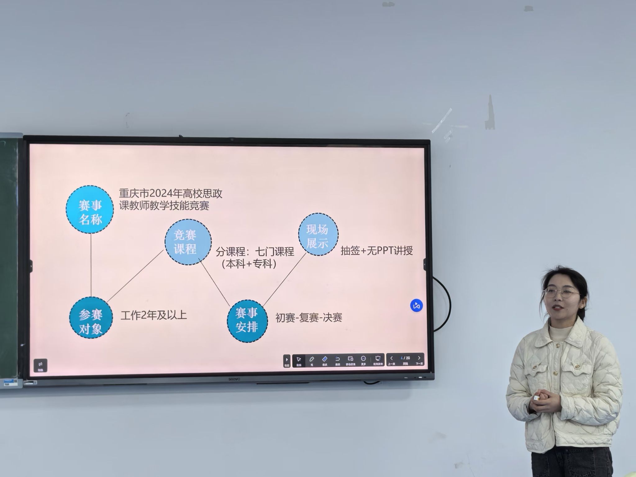 会议伊始,马克思主义学院思想道德与法治教研室的李潇潇老师率先分享了其参加重庆市2024年高校思政课教师教学技能竞赛并荣获市级三等奖的宝贵经验。李老师细致入微地介绍了参赛对象、竞赛课程、竞赛流程及现场展示等各个环节,为在座的老师们呈现了一场精彩纷呈的教学竞赛经验介绍。