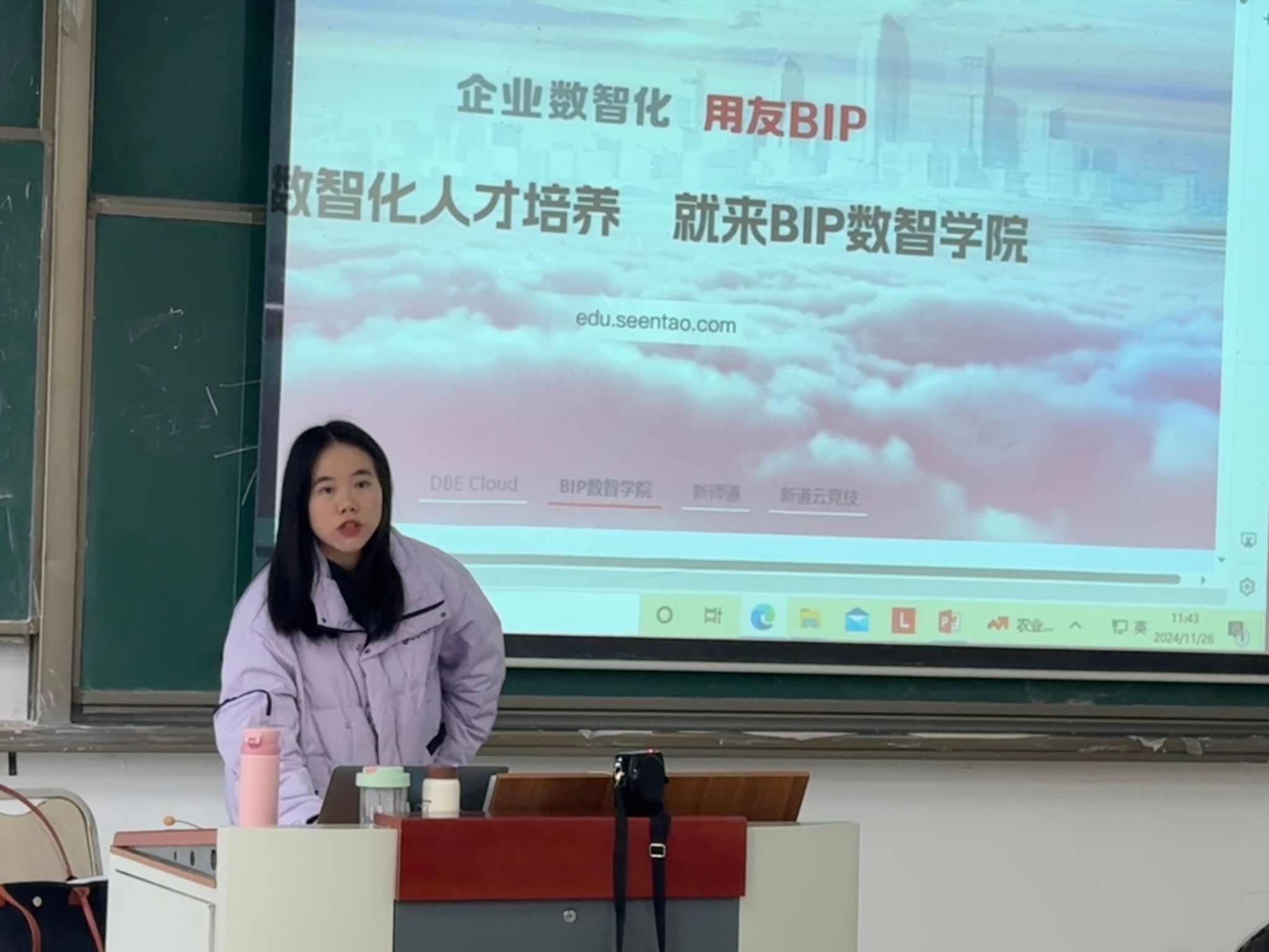 为深化课程改革,财务管理教研室积极推进高管进课堂,帮助增强学生的理论与实践结合能力、提升学生的职业规划能力、促进校企合作以及拓宽学生的视野。11月25日、26日,钱万老师邀请了新道科技股份有限公司高级技术顾问朱小芳老师进入到《工商管理类专业导论》的课堂中,向2024级财务管理专业1-4班的大一新生们分享财务管理的智能化发展与应用,强化了对财务管理专业的认知。