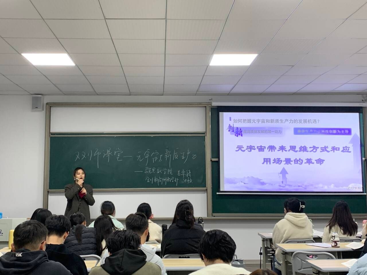 为了加强各学科之间的联系,培养学生的跨学科思维创新能力,12月5日晚上19:00在4203教室马克思主义学院的吕柔倩老师与合川新商科教学部的张颖老师共同开展了主题为“元宇宙助力新质生产力发展”的双师课堂。