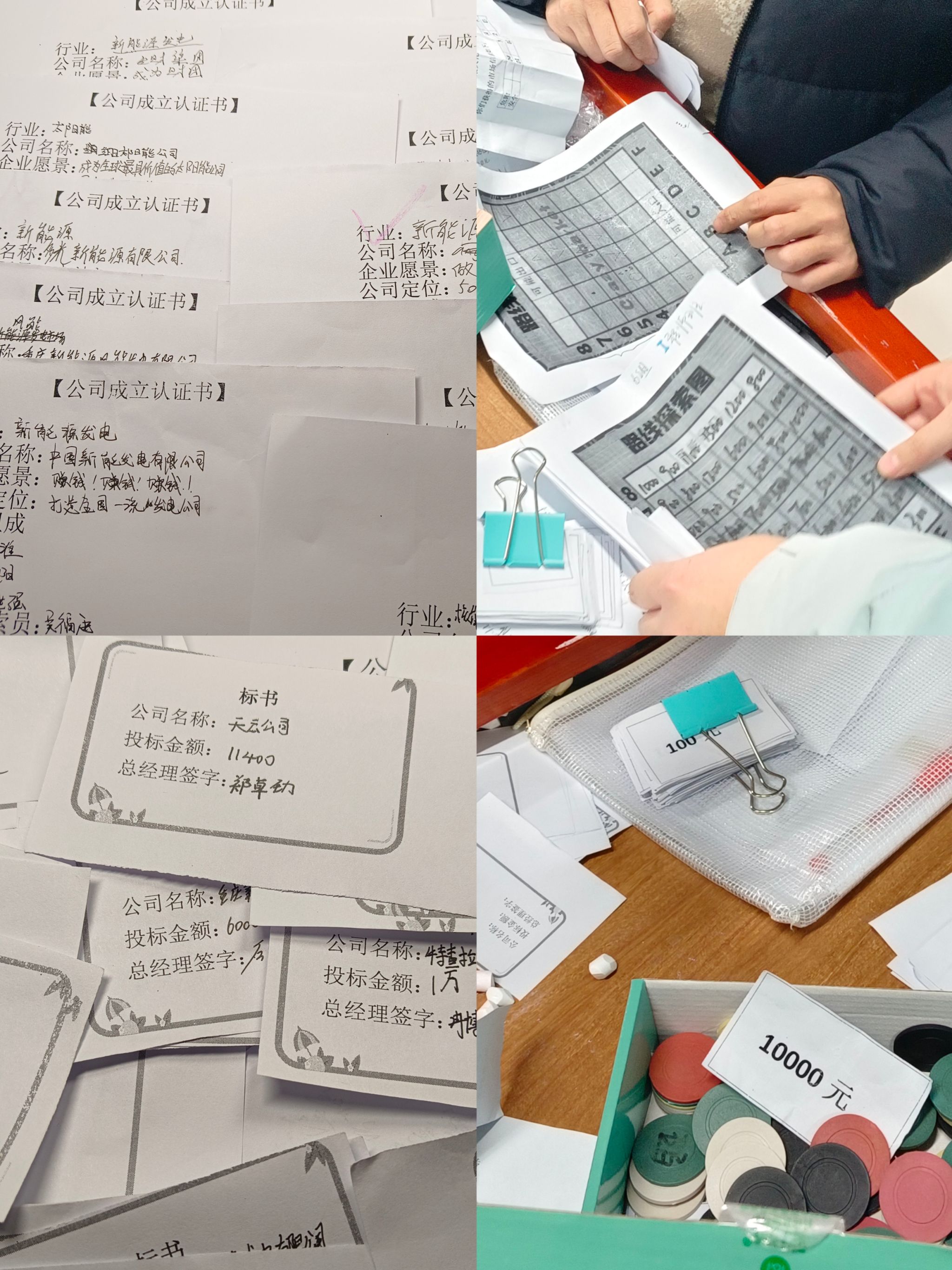 课堂伊始,雷显帅老师凭借其在新能源领域深厚的专业知识,系统地讲解了新能源发电方式。例如,详细阐述了太阳能发电的原理、风力发电的技术特点、潮汐发电等多种发电技术,为学生们奠定了坚实的理论基石。随后,新商科教学部的夏兴钰老师接力课堂教学,进一步深化了课程的实践与理论融合维度。夏老师巧妙地将新能源发电技术与企业战略管理有机结合,借助极具创新性和互动性的“疯狂市场——模拟沙盘游戏”展开教学活动。在游戏中,学生们被分成若干小组,各自组建虚拟公司,每个团队成员明确分工、相互协作,共同经历从公司架构搭建到团队文化建设的全过程,充分体验真实商业环境下的团队运作模式。