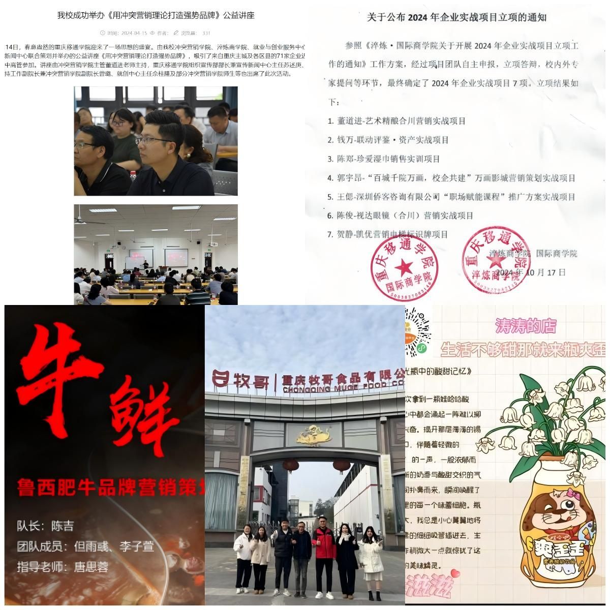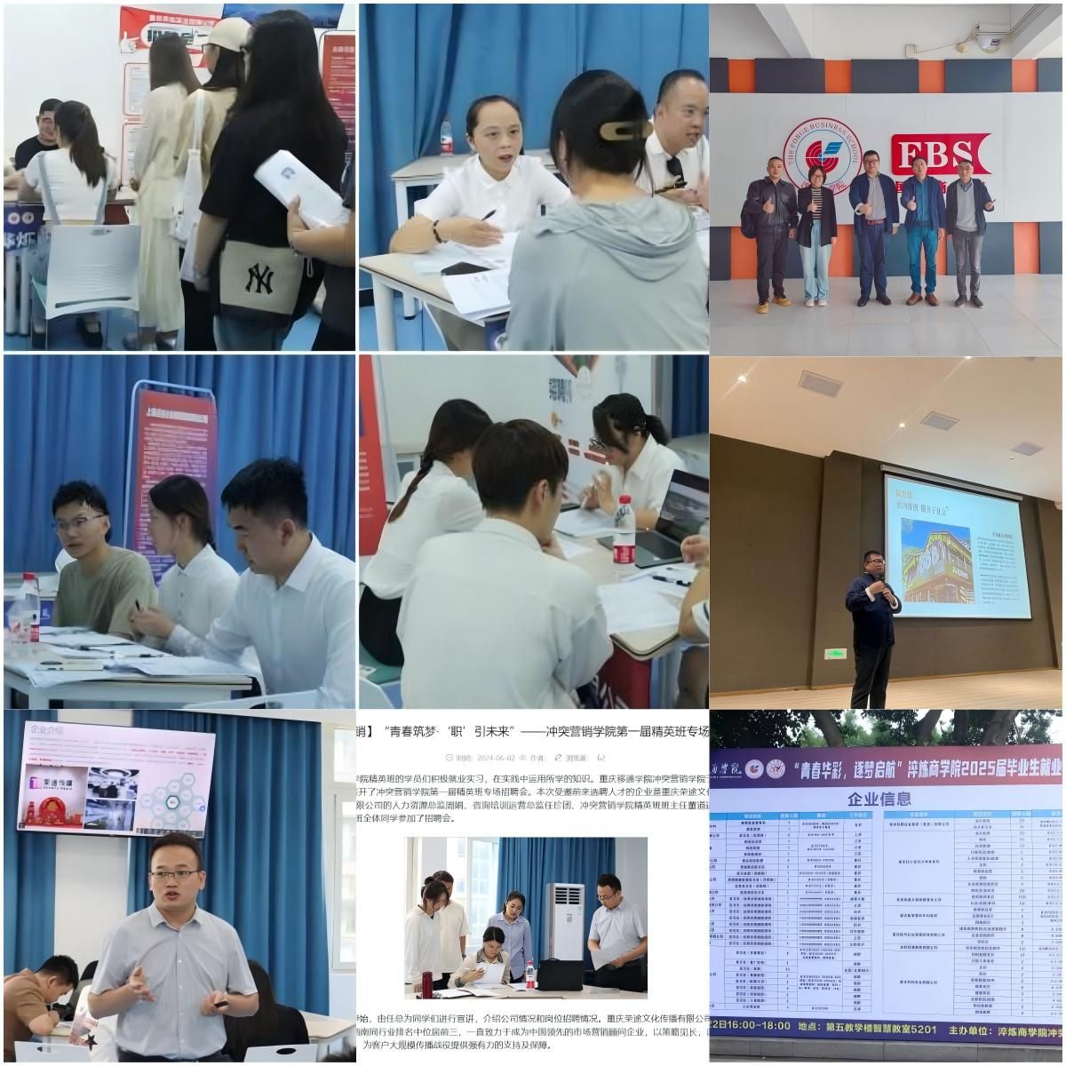 2024年学院与陈昌银麻花建立深度合作伙伴关系,成立《销售与渠道管理》陈昌银麻花店长班。冲突营销学院第一次举办多场招聘会,5月31日重庆荣途文化传播有限公司专场面试会打响第一枪。6月22日“青春华彩·逐梦启航”双选会邀请26家企业,提供640个岗位,第一届品牌策划精英班学员除考公、考研同学外,均收到实习OFFER。