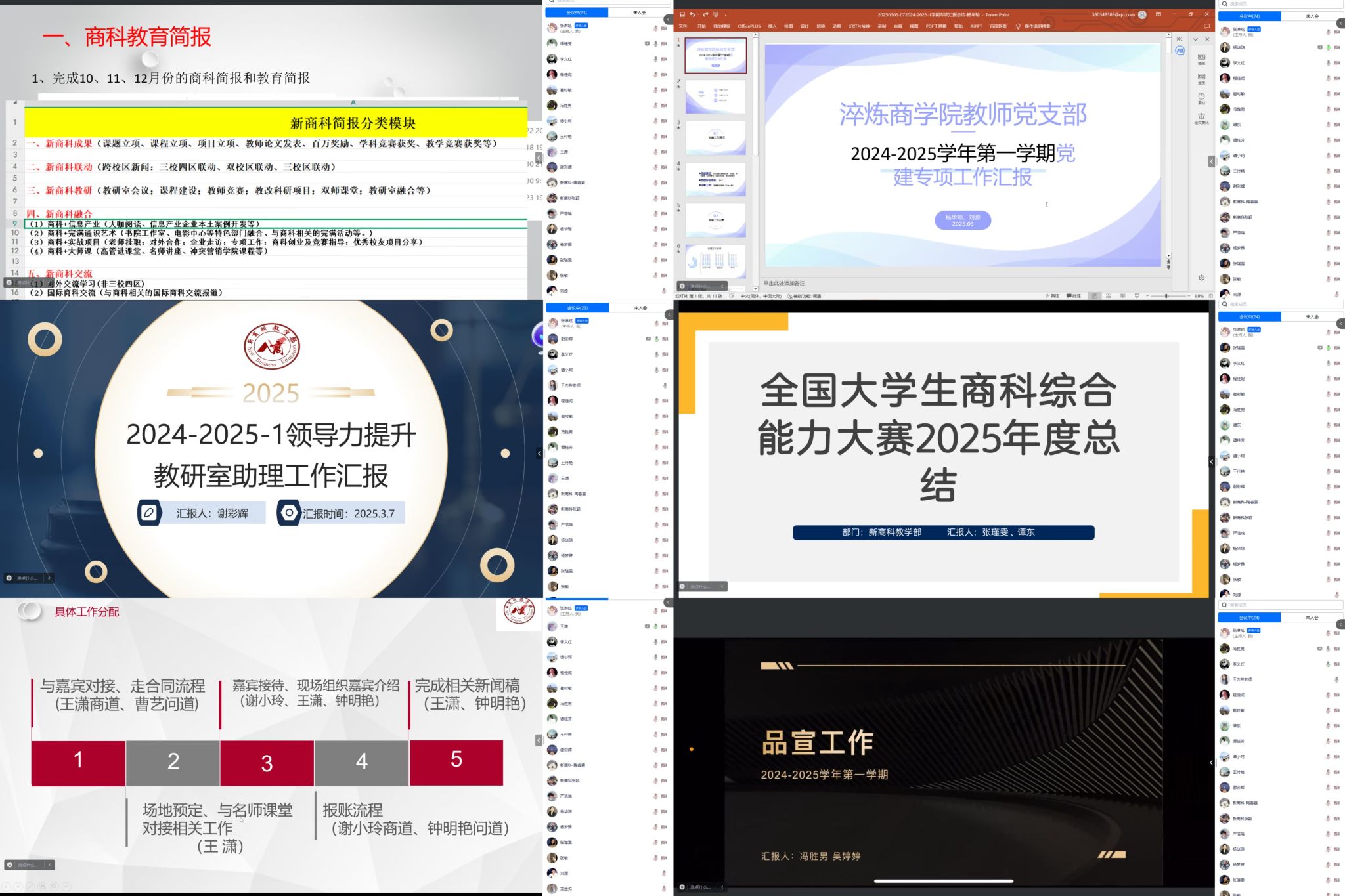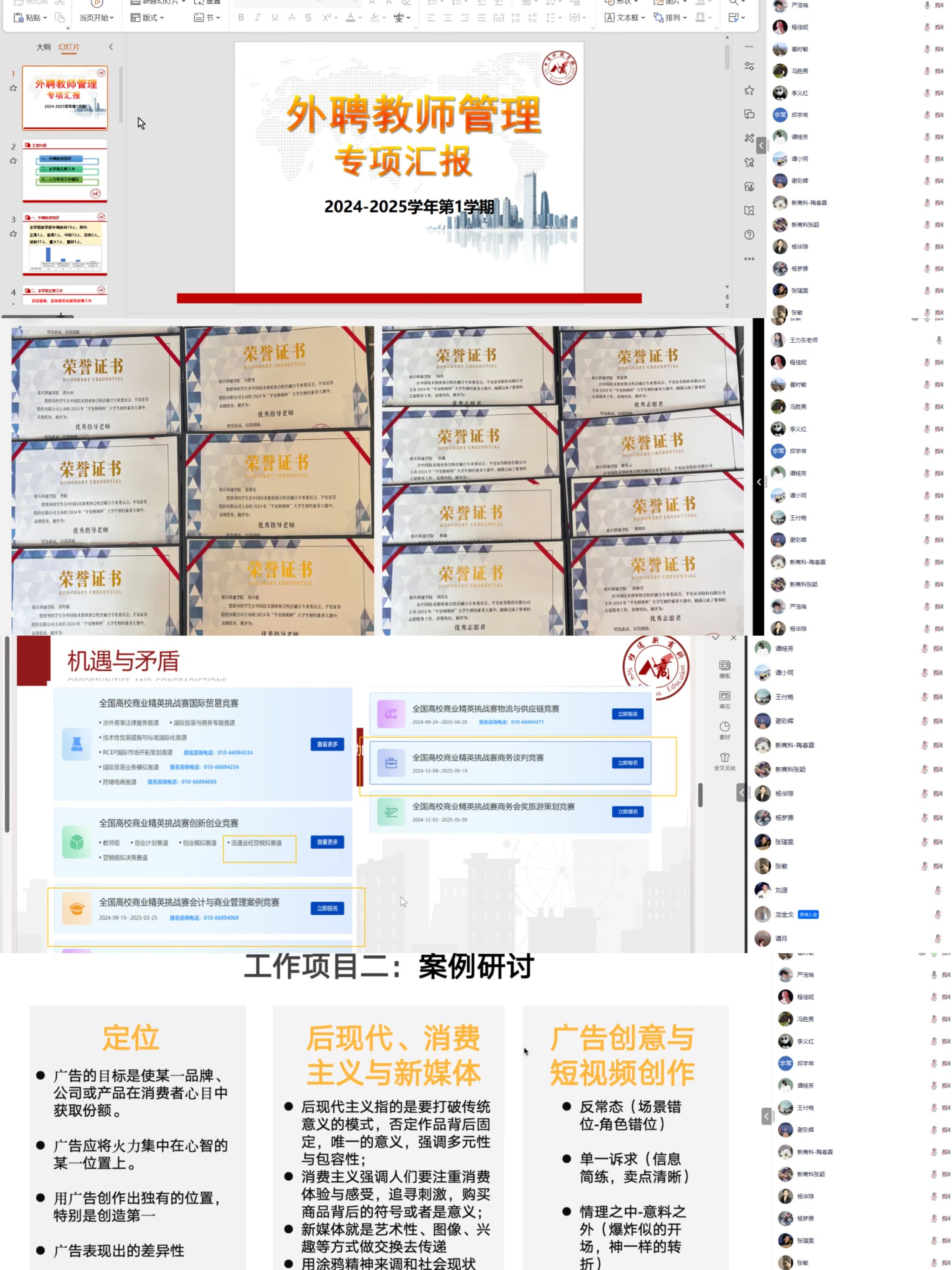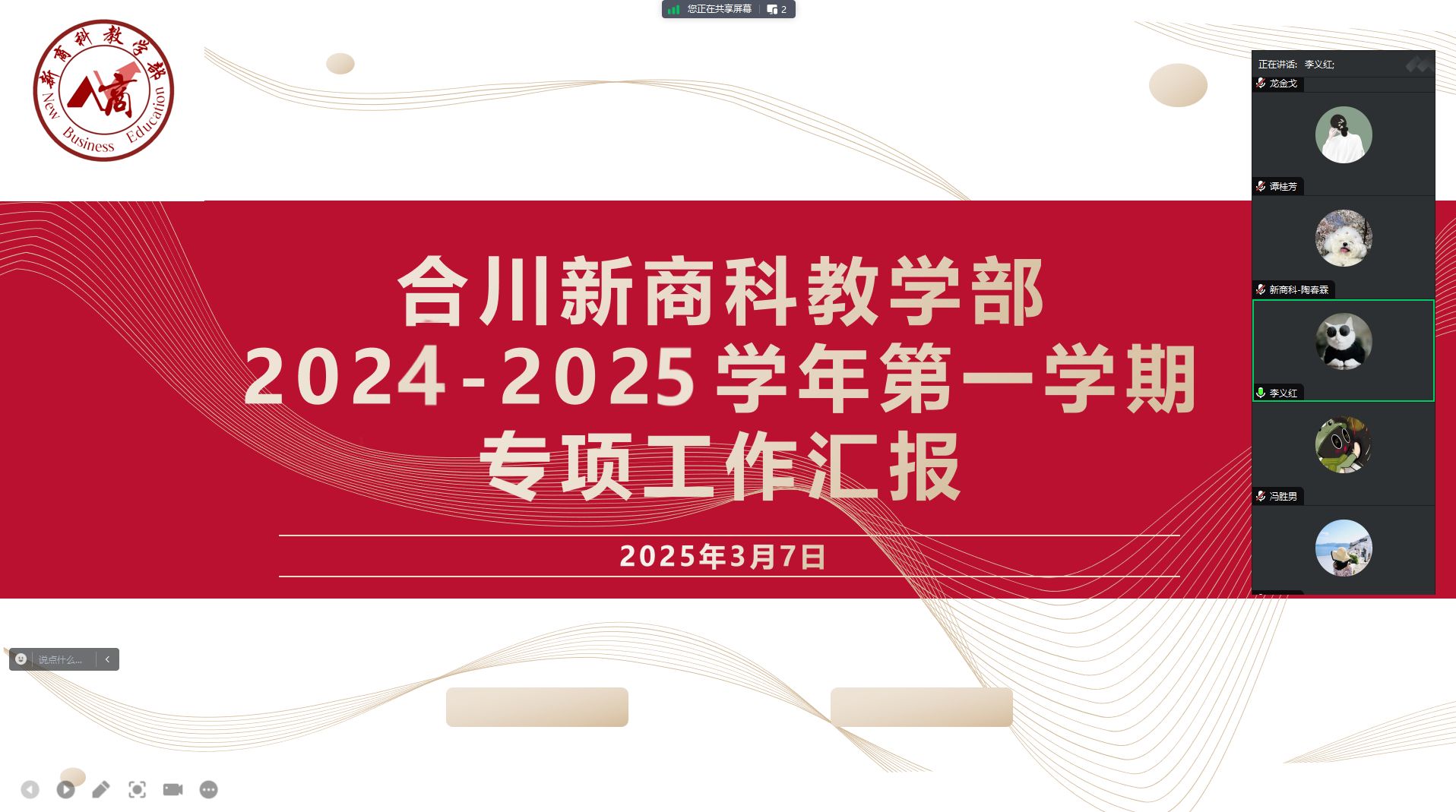 为了解2024-2025学年第1学期各项专项工作的实施成效与推进进度,为后续工作的有序开展提供依据。3月7日,合川新商科教学部以线上形式开展 2024 - 2025学年第 1 学期专项工作答辩会议,会议由教学部副主任李义红主持,各专项成员参与。