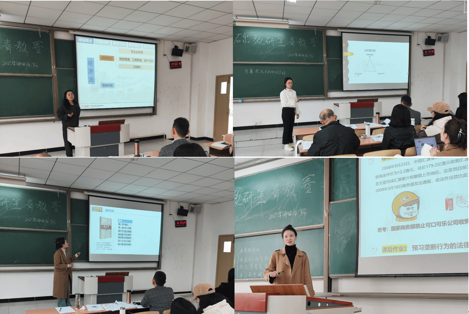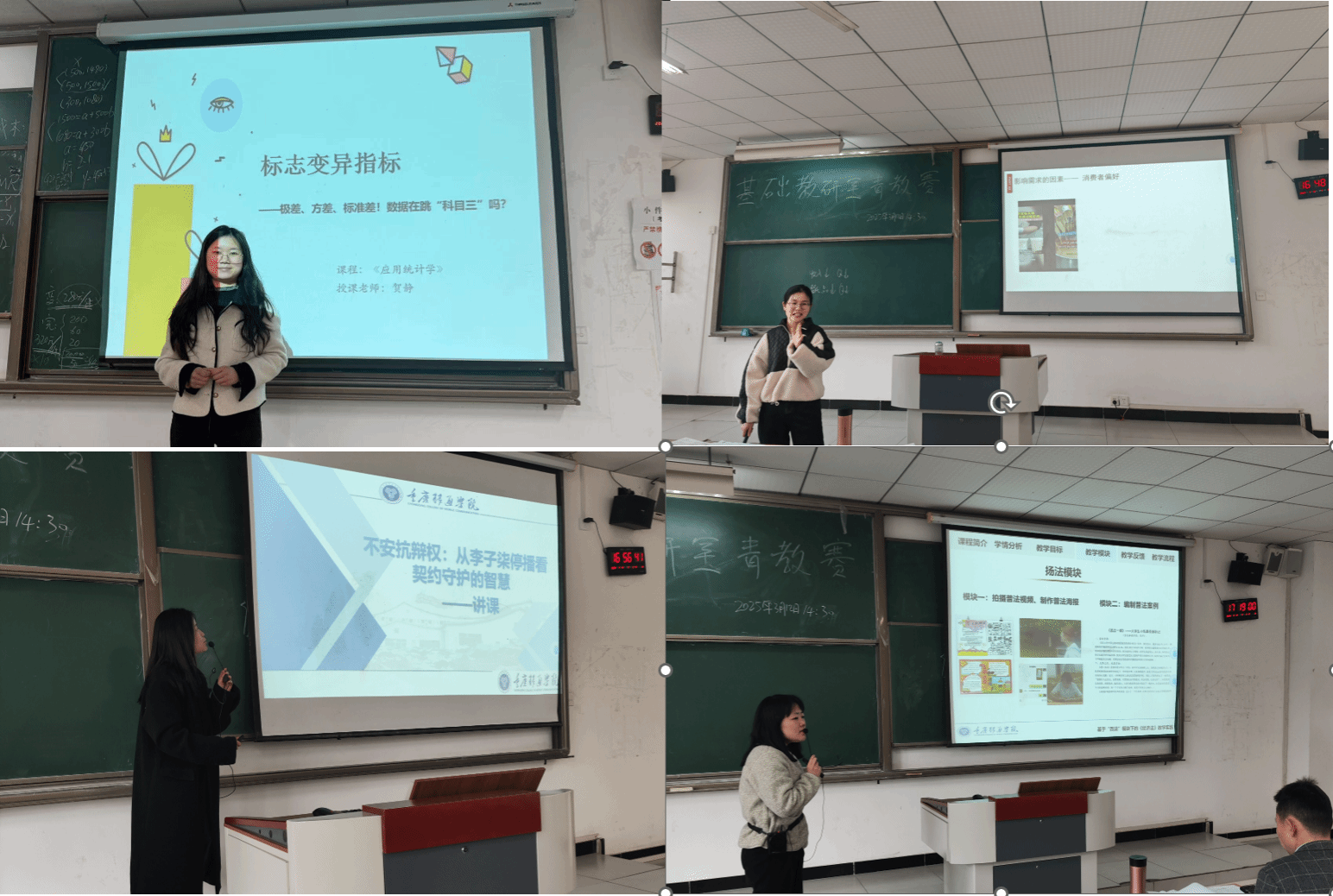 参赛的8位教师依次展开5分钟的说课和15分钟的讲课:1、袁黎黎老师通过项目式学习法,引入有趣生动的例子讲授有效合同的生效要件,提醒大家要小心无效合同;2、陈俊宇老师利用校园快递站包裹不同时段的流量差异,生动讲解了时间数列的四大影响因素;3、郝文慧老师通过我国新能源汽车产销量的不断增长,讲授了同比、环比、定基三种增长速度的计算以及应用场合;4、周琴宇老师利用知网和阿里巴巴两个知名企业被处巨额罚单的例子引出了经济法中的反垄断法,给大家讲解了反垄断法中的四种规制,充分激发了大家的好奇心;5、贺静老师利用现实中学生的成绩为话题,引入标志变异指标的内容,介绍了四种不同变异指标的计算以及应用场合;6、廖林老师利用生活中奶茶销售的案例,讲解了影响需求的因素以及需求曲线的变化,最终强调真正的知识应与学生的实际生活紧密联系;7、李姮老师通过李子柒与微念公司的合作,讲解了不安抗辩权的相关知识,同时,强调了敬业、诚信才是最好的流量密码,网络不是法外之地。8、刘璐遥老师以电视剧“武林外传”为例,结合书商和吕秀才签订合同的片段帮助学生分析在《中华人民共和国民法典》的背景下的吕秀才的救济之路,引导学生理解民法的自愿、公平原则,感知法律的魅力。