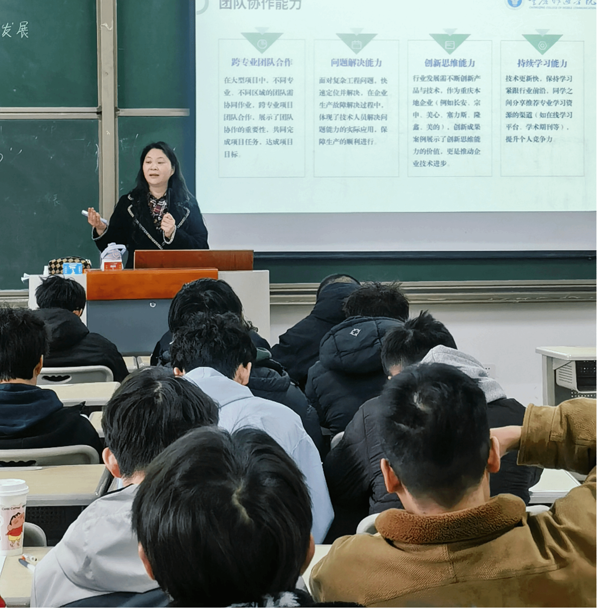 单旭燕老师继续从重庆的地理优势和经济发展的历史脉络出发,引导学生思考重庆在国家区域发展战略中的定位,并组织各小组围绕重庆的就业、人才、企业、产业和重要品牌等进行深入讨论。同学们结合自身专业,分享了对重庆就业前景和岗位需求的认识。电气工程及其自动化专业的学生普遍认为随着重庆智能电网建设的推进,PLC编程和电力系统仿真能力将成为就业的关键技能;轨道交通智能与控制专业的学生则对标重庆轨道交通建设规划,认为掌握CBTC信号系统原理是未来就业的必备技能;机械制造及其自动化专业的学生关注工业机器人集成应用方向,认为考取机械工程师认证将为就业加分;车辆工程专业的学生结合长安深蓝等本土品牌的新能源转型趋势,提出电池管理系统(BMS)技术研习的重要性。