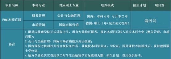 此项目是重庆移通学院唯一的本硕直通项目,现对本校已录取的所有在校生开放招生报名通道!报名本项目后转入对应本科专业,本科4年学习及相关课程由重庆移通学院国际商学院负责,配套雅思分层学习、管理课程强化学习、导师全程跟踪指导等帮助;1年的国外硕士培养由德国埃森经济管理应用技术大学(FOM大学)负责,配备资深德国专业教师、中文助教/翻译。国内课程考核通过并符合条件者可获得我校本科毕业证、学位证,国外课程考核通过后,可获得全球通用、中国教育部认可的文学硕士学位(Master of Arts)。