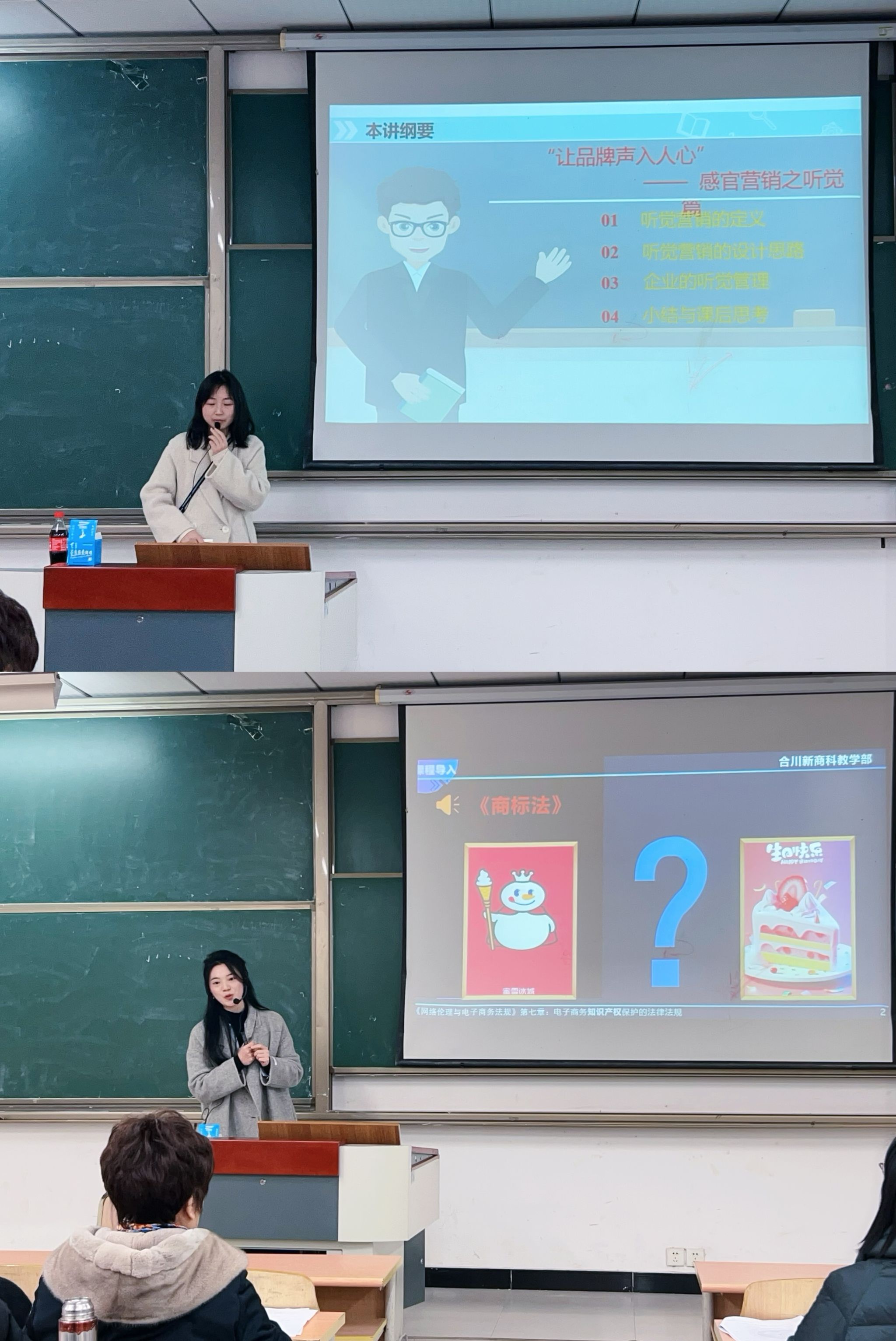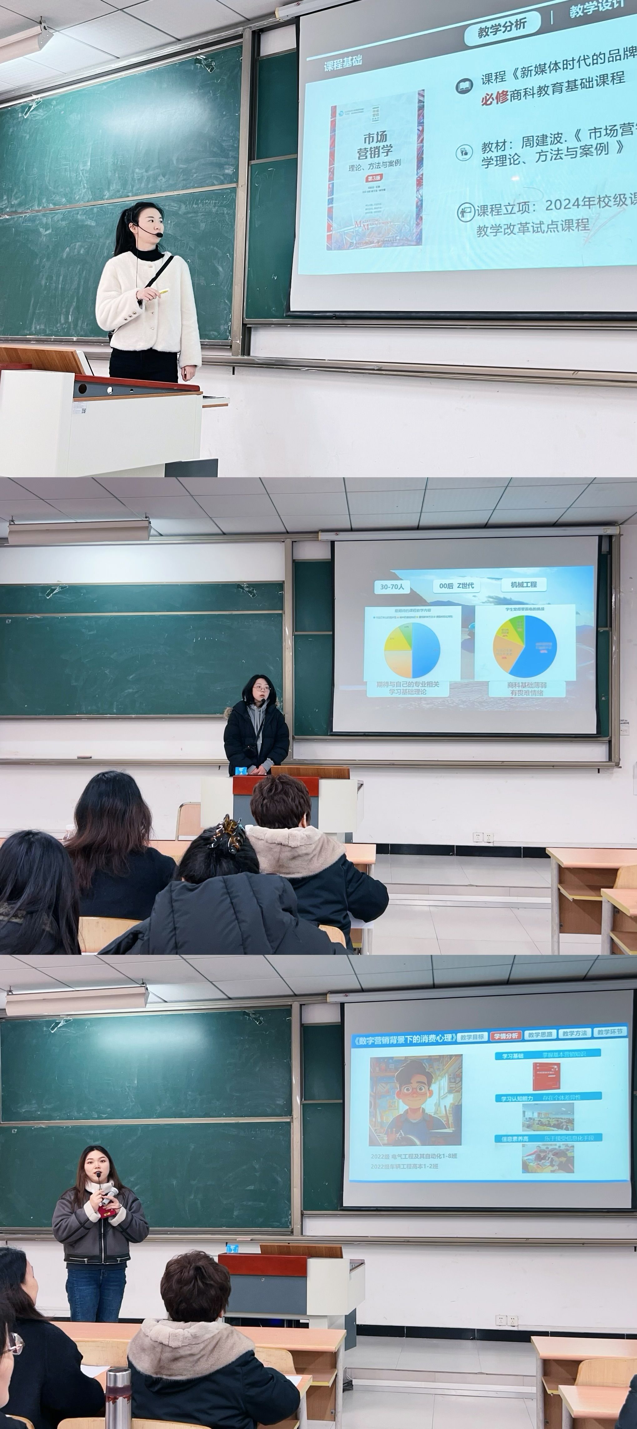 梁家宇老师则通过“90后夫妻的房贷选择”这一现实案例,将等额本息与等额本金的知识点紧密结合在一起。他生动、详细的讲解,让在场的师生对这两个概念有了更加直观、深刻的理解。而杨梦雅老师则以“你的关注是你的选择吗”这一提问,巧妙地将大家带入《网络广告与新媒体传播》中议程设置的学习议题。她循循善诱的教学方式,激发了学生们的学习兴趣,也让在场的评委们赞不绝口。