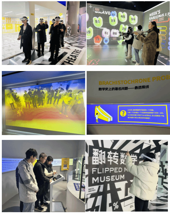 第二站是“元宇宙数学馆”,是国内首个以数学与元宇宙科技体验为核心的互动展馆。馆内通过独特的视听语言技术和沉浸式互动体验,将师生们从二维带入到四维世界,展开了一场与数学的深度对话。学生通过虚拟现实技术,亲身体验了几何图形的动画演示、数学分形艺术的视觉震撼以及数学建模的实际应用,充分了解到抽象数学可视化表达,并深刻认识数学是构建元宇宙的基础要素和核心驱动力。