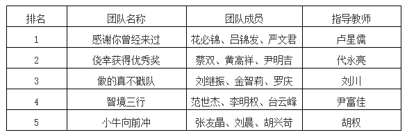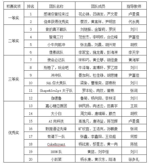 根据《重庆移通学院关于举办第六届数据库应用程序设计大赛的通知》具体内容,我校经过线上报名、作品提交、初选评定、决赛评定等环节,评选出校级一等奖2组,二等奖4组,三等奖6组,优秀奖8组,并决定推出得分前五名队伍代表学校参加6月份的市级比赛。现将具体获奖名单及相关事项通知如下: