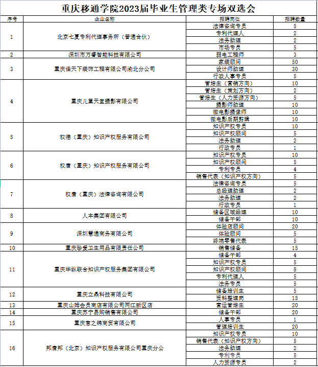 为了给毕业生和用人单位搭建更便捷的交流平台,更好的促进我校2023届毕业生顺利就业,学校定于2022年10月12日10:00在第五教学楼(5201、5203)举行重庆移通学院2023届毕业生管理类专场秋季双选会,届时将邀请16家用人单位莅临我校招聘英才。人才需求涵盖多个行业。欢迎广大应届毕业生积极关注,踊跃参加。请2023届同学们做好相应准备,积极参加此次双选会。