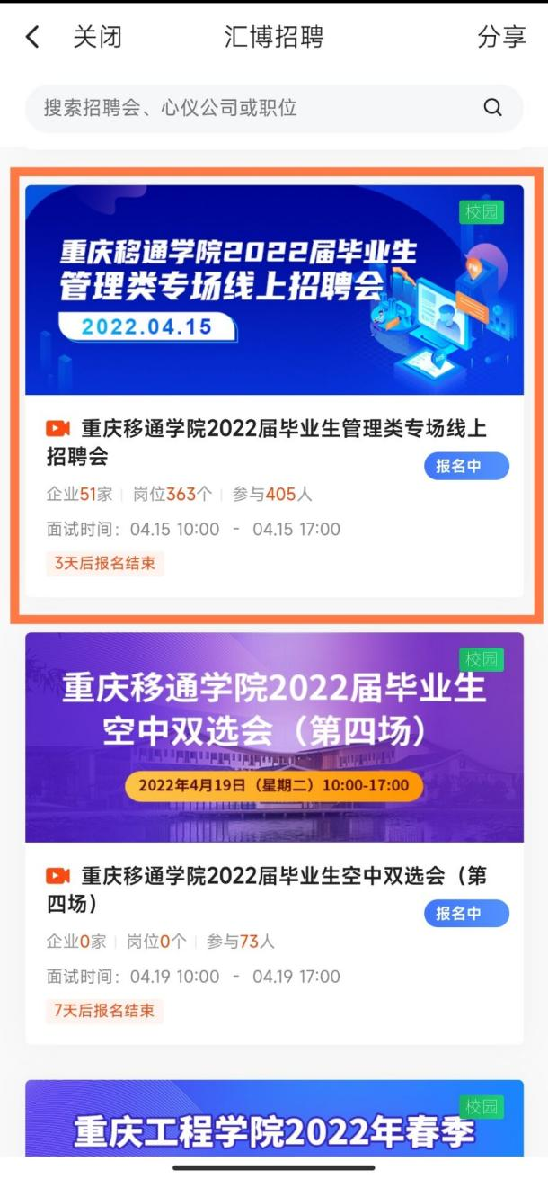 1、扫码下方二维码或前往应用市场下载“汇博招聘”APP完成下载并注册登录。点击下方菜单栏“发现-视频招聘会”,选择“重庆移通学院2022届毕业生管理类专场”线上招聘会,进入活动页面。(可点击链接http://huibo.cn/00P1D提前查看参会企业详情,视频面试功能需通过APP入口进入)(若进入APP首页无视频招聘会入口,请在简历管理中把薪资设置为6000元以下)
