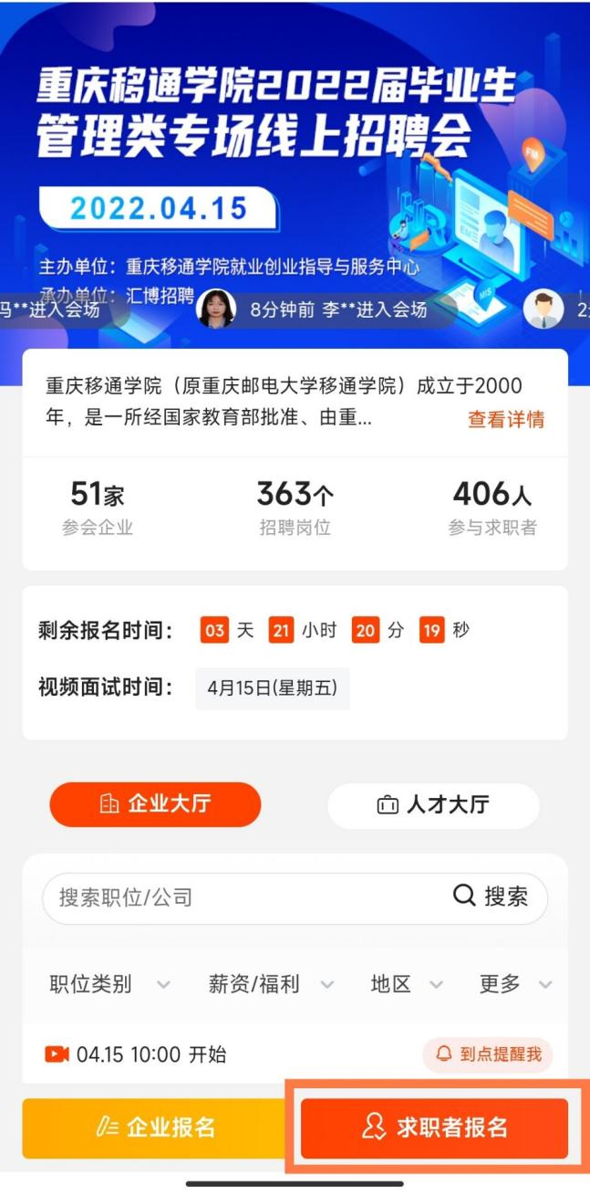 2、点击进入对应场次后,点击下方求职者报名,并根据要求填写报名信息。