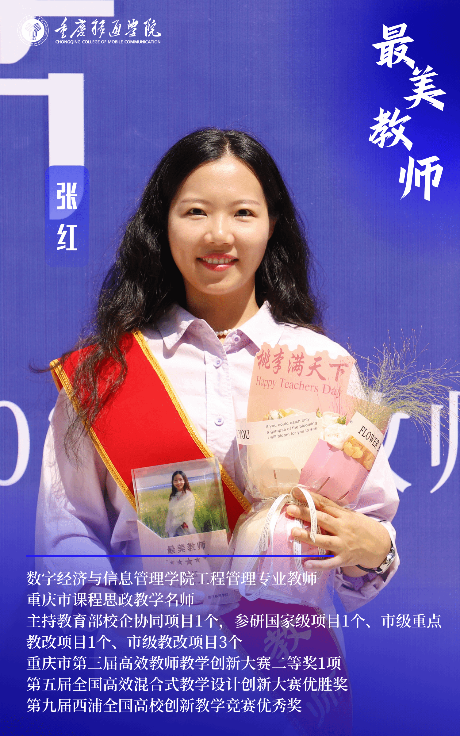 张红,女,1990年3月出生,四川广安人,中共党员,数字经济与信息管理学院工程管理专业教师,讲师,綦江校区校级督导员。重庆市课程思政教学名师,重庆市合川区优秀教师,重庆市课程思政示范课程1项,重庆市线下一流课程1项,重庆市示范教学案例1项,校级第三批教学团队带头人,主持校级项目1个,主持教育部校企协同项目1个,参研国家级项目1个、市级重点教改项目1个、市级教改项目3个,获得校级教学成果三等奖3项,教材1部,专著1部,公开发表论文多篇。重庆市第三届高效教师教学创新大赛二等奖1项,荣获“远景杰出教师”4次、“远景优秀教师”1次、“教学优秀奖”1次,校级青年教师教学竞赛“一等奖”1次;校级教案评比“一等奖”1次;校级首届课程思政教学竞赛“二等奖”1次;校级创新教学大赛“二等奖”2次;数信学院教学竞赛“一等奖”3次;数信学院首届课程思政教学竞赛“一等奖”1次;数信学院梦想与实践征文及演讲比赛“一等奖”2次,第五届全国高效混合式教学设计创新大赛优胜奖,第九届西浦全国高校创新教学竞赛优秀奖,指导学生参加各类国家级、省部级、校级学科竞赛获奖60余项。